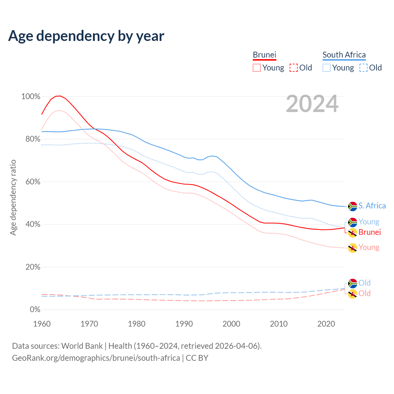 - The share of old-age demographic (65+) in Brunei is 6.87% vs 6.69% in South Africa.