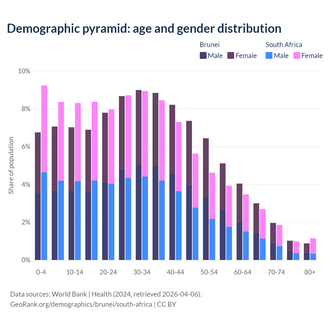 - The median age in Brunei is 33.2 years compared to 29.5 years in South Africa.