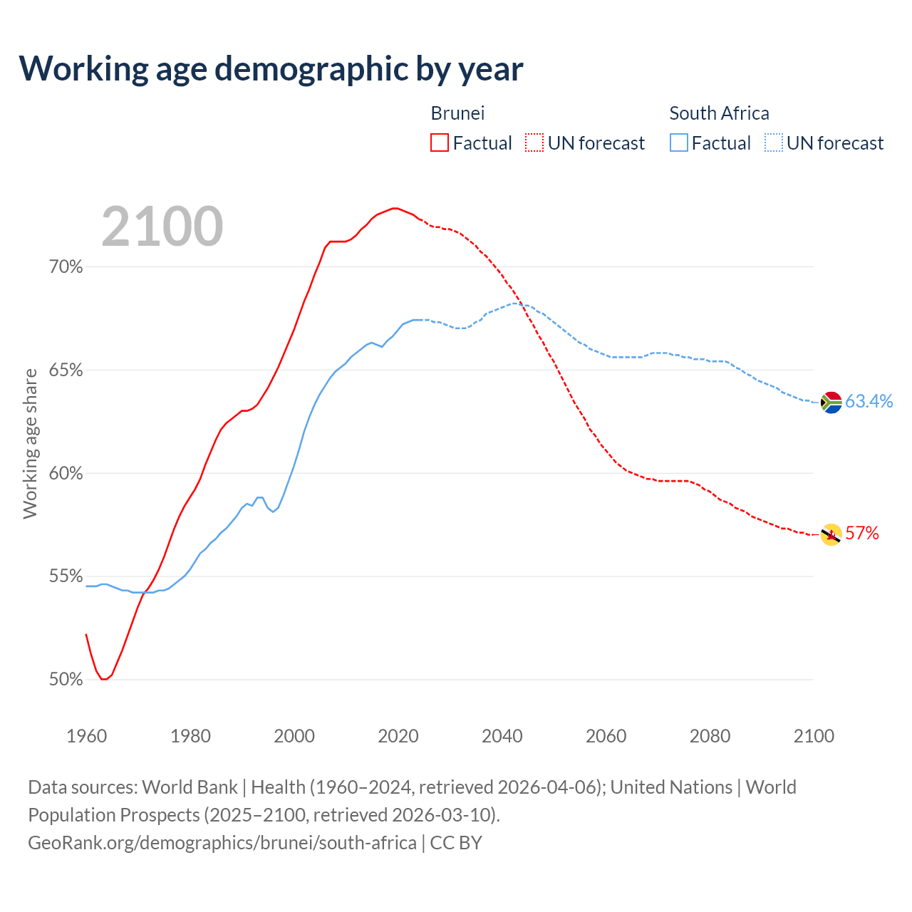 Median age Brunei vs South Africa, 1960-2100