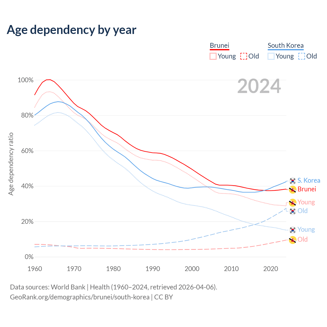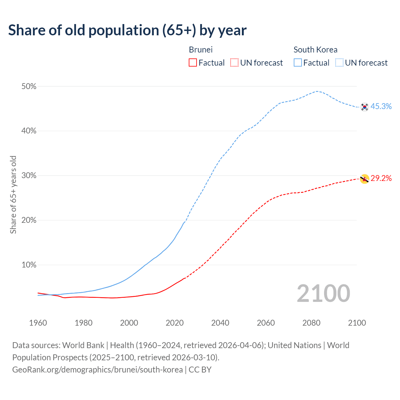 The share of older people aged 65 and over is 6.87% in Brunei and 19.3% in South Korea. Life expectancy in Brunei compared to South Korea .