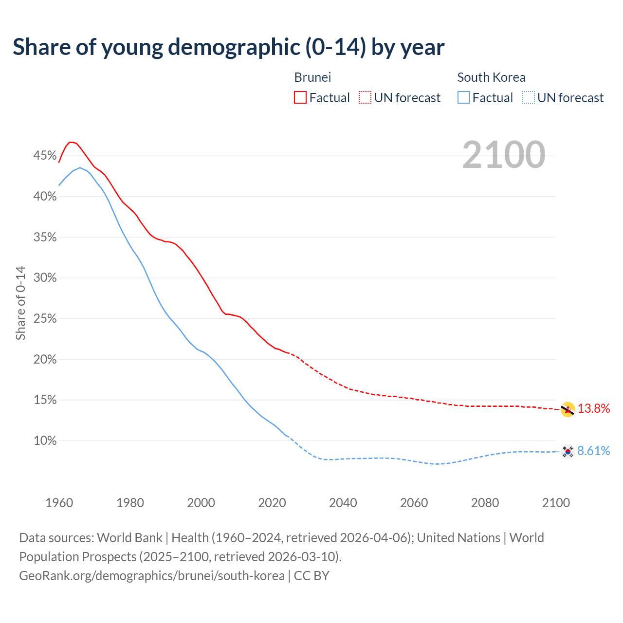 Median age Brunei vs South Korea, 1960-2100