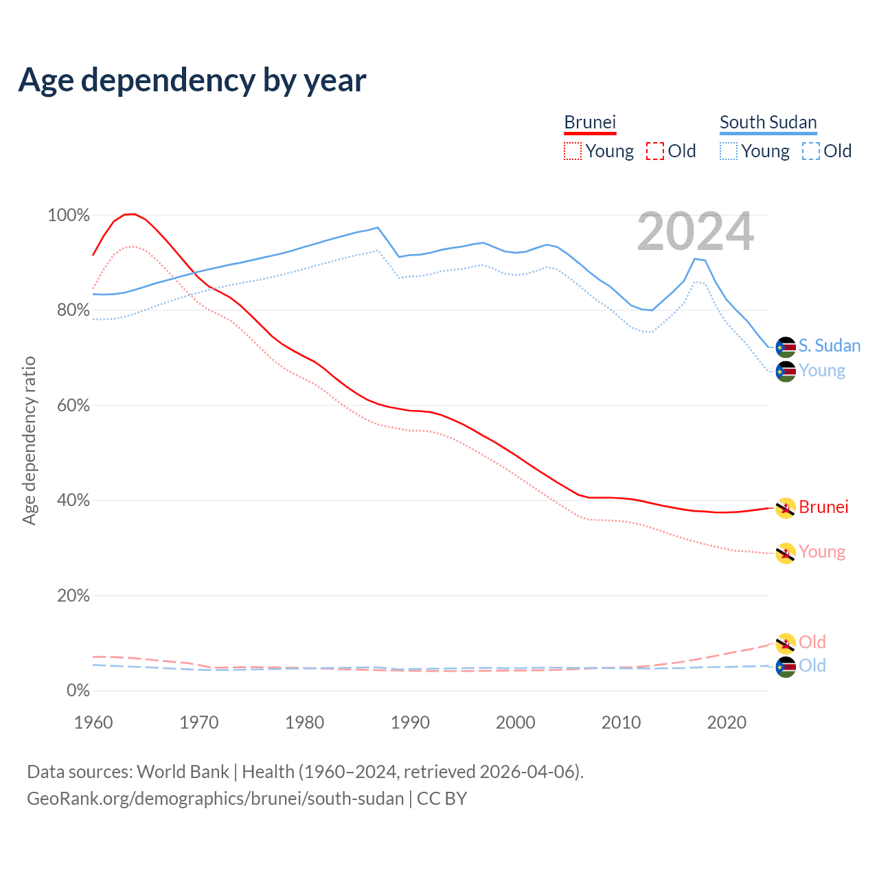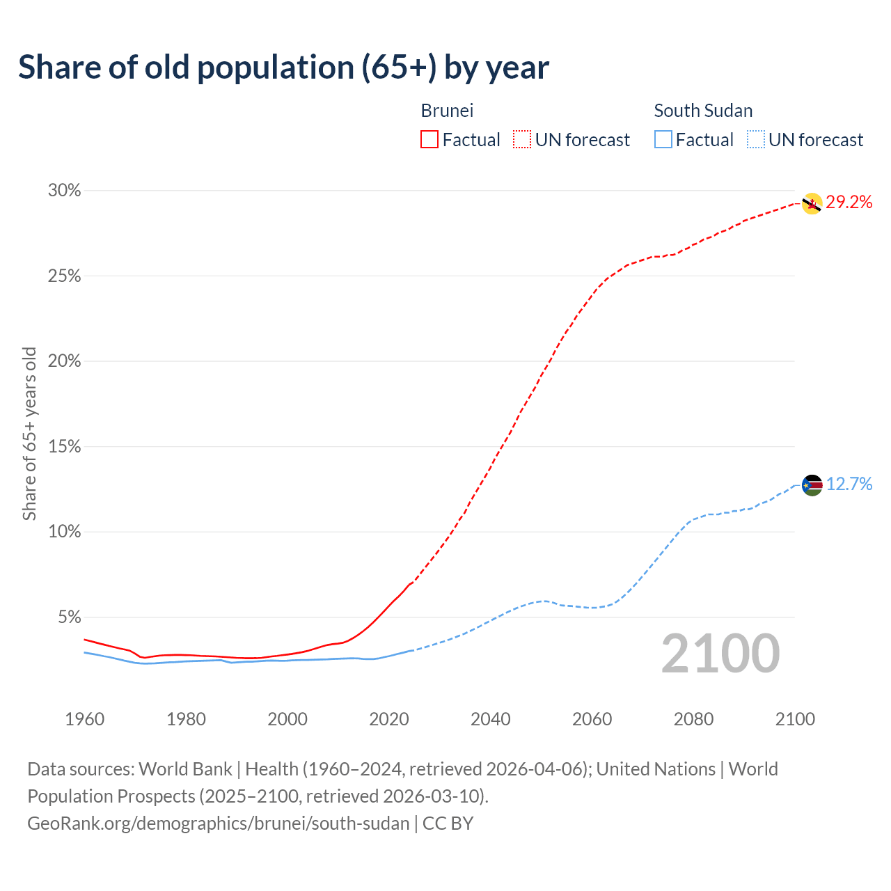 - The share of old-age demographic (65+) in Brunei is 6.87% vs 2.99% in South Sudan.