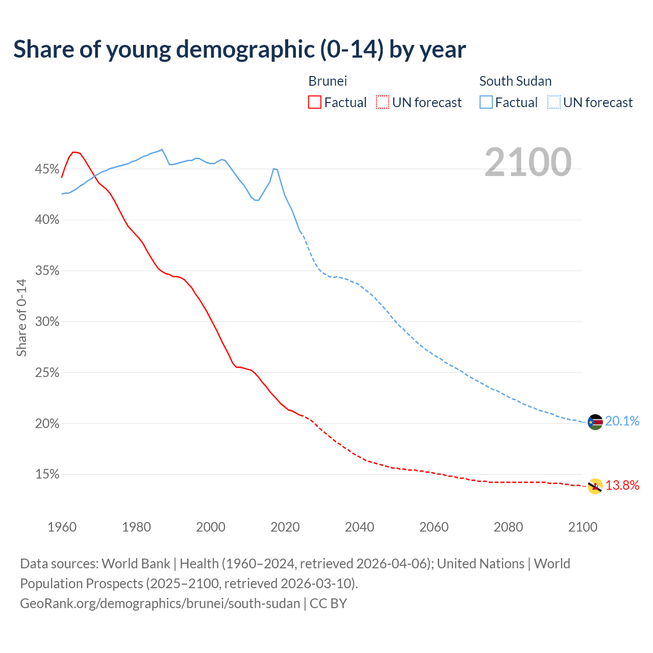 Median age Brunei vs South Sudan, 1960-2100