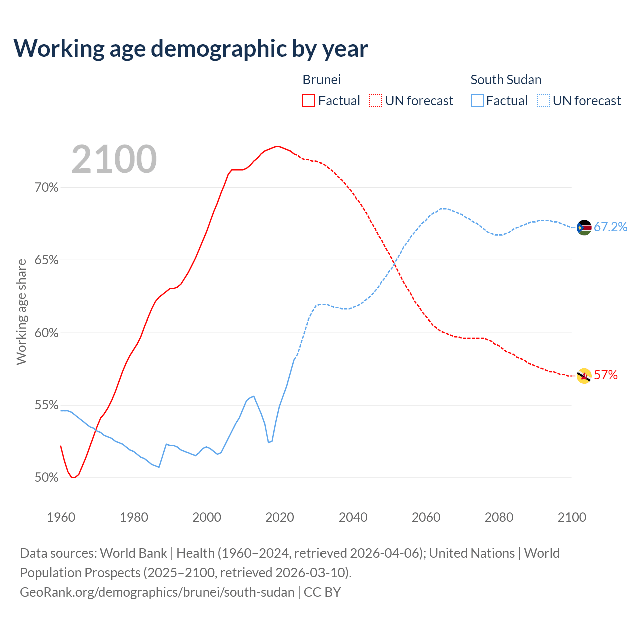 - Brunei has 340K working age adults (aged 15-64) vs 7.27M in South Sudan.
