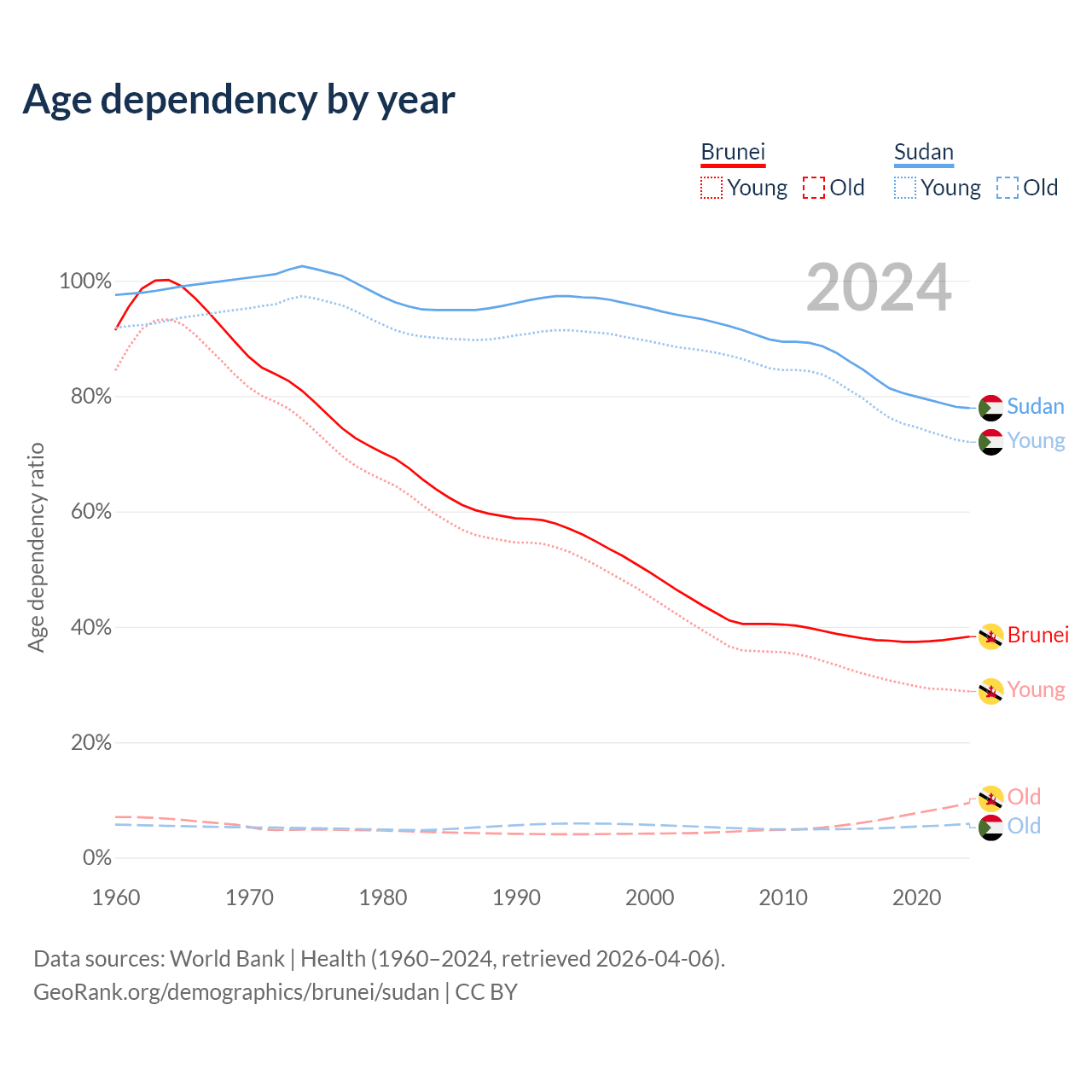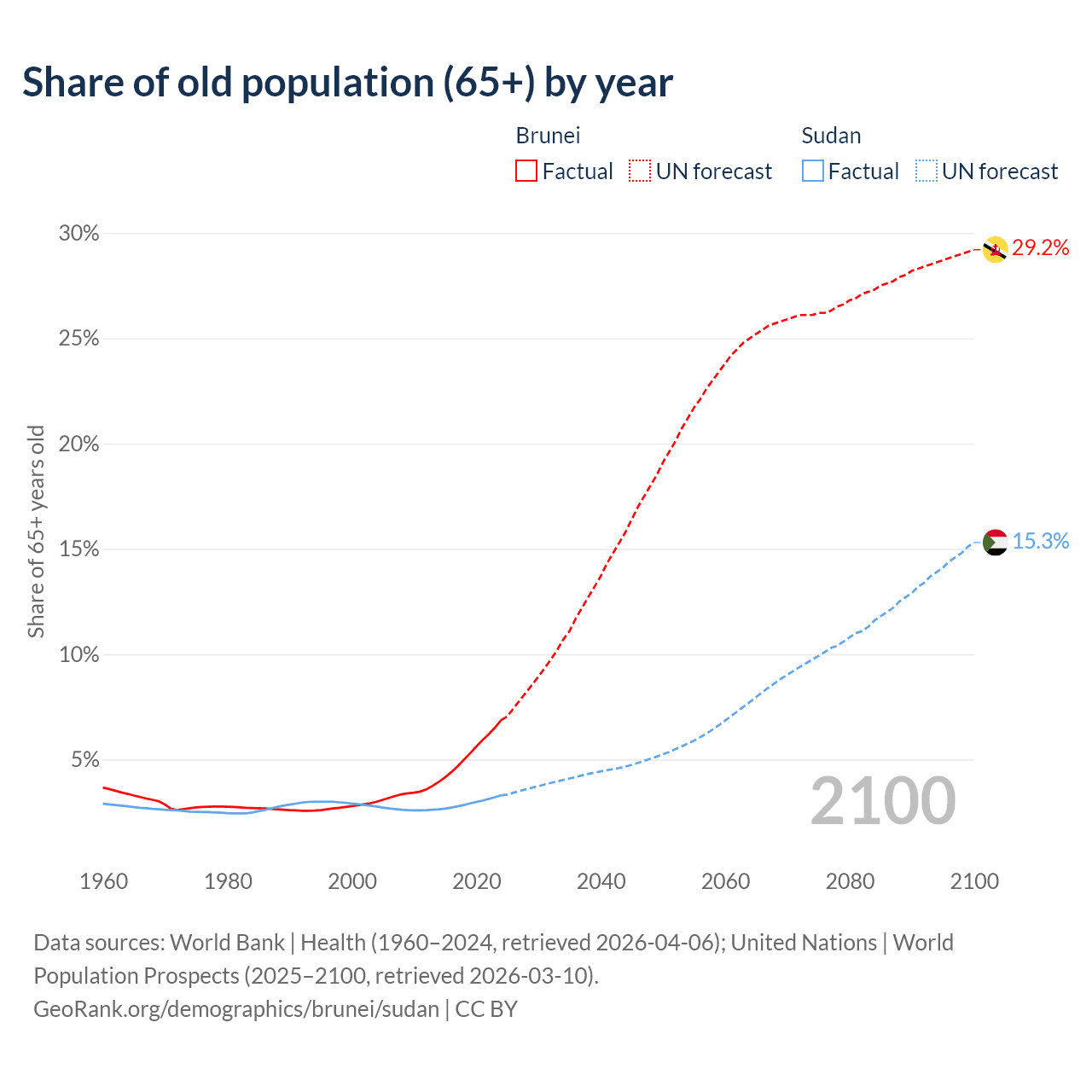- The share of old-age demographic (65+) in Brunei is 6.87% vs 3.3% in Sudan.