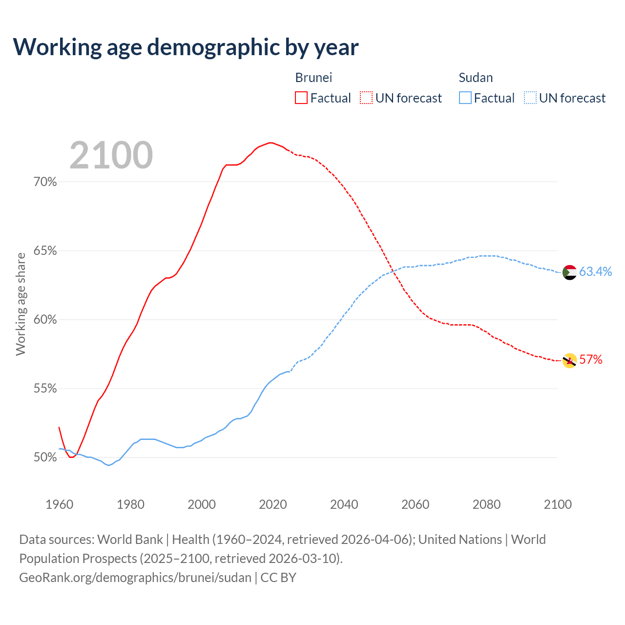 Median age Brunei vs Sudan, 1960-2100