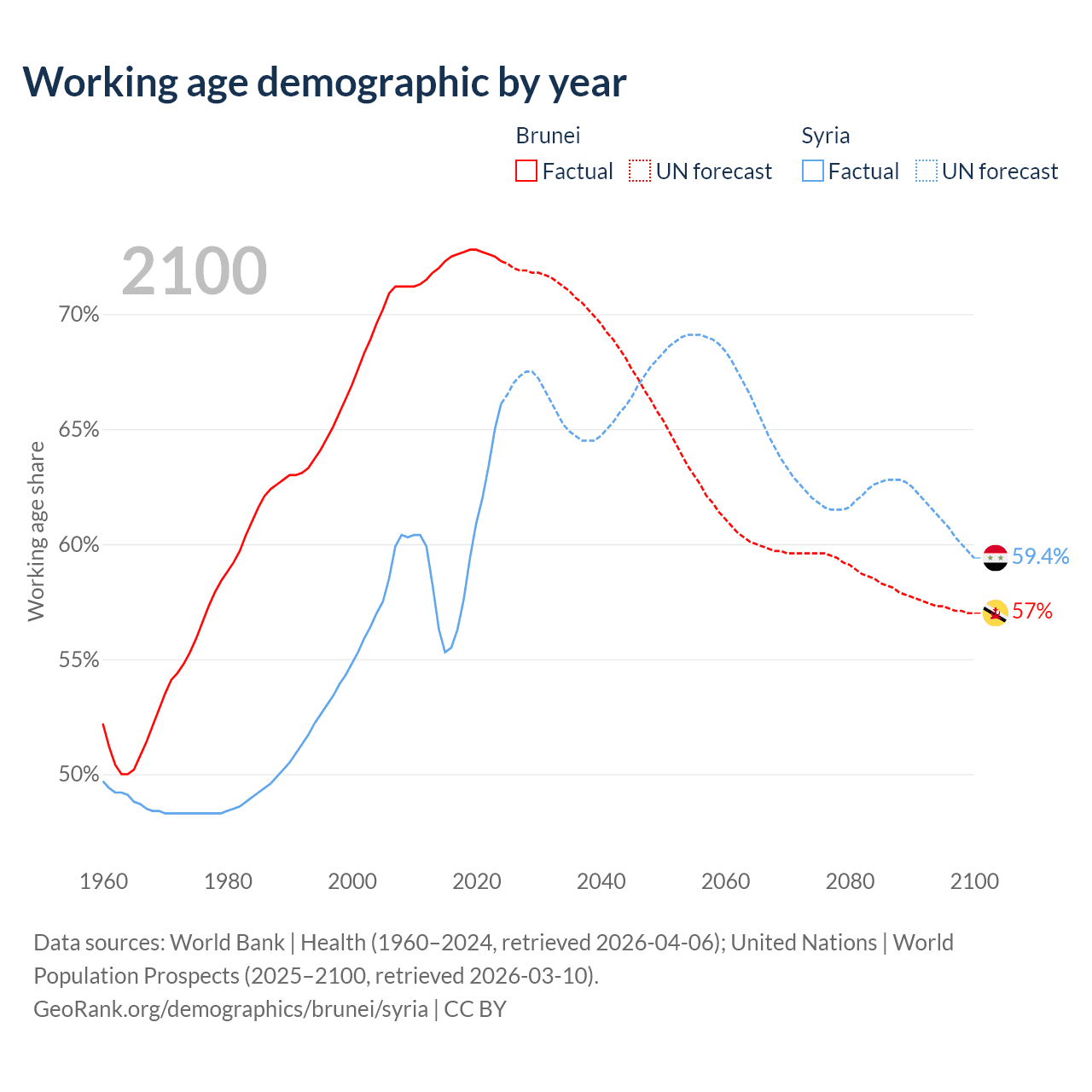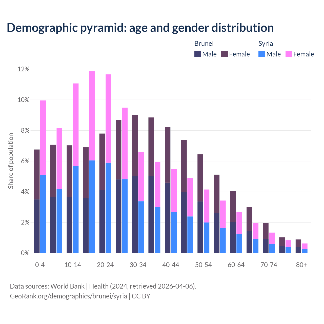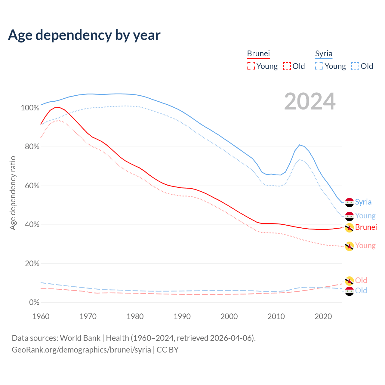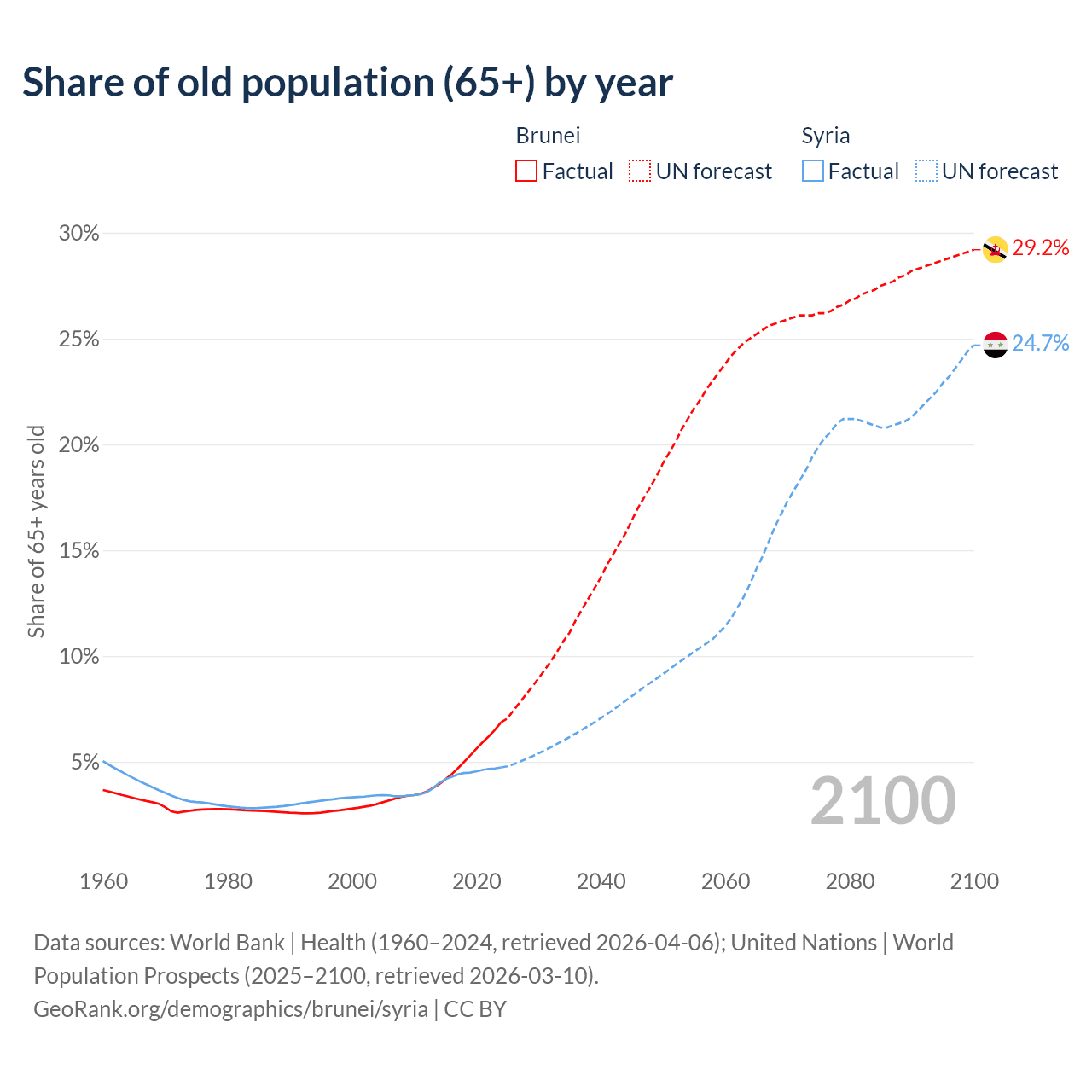 - The share of old-age demographic (65+) in Brunei is 6.87% vs 4.74% in Syria.
