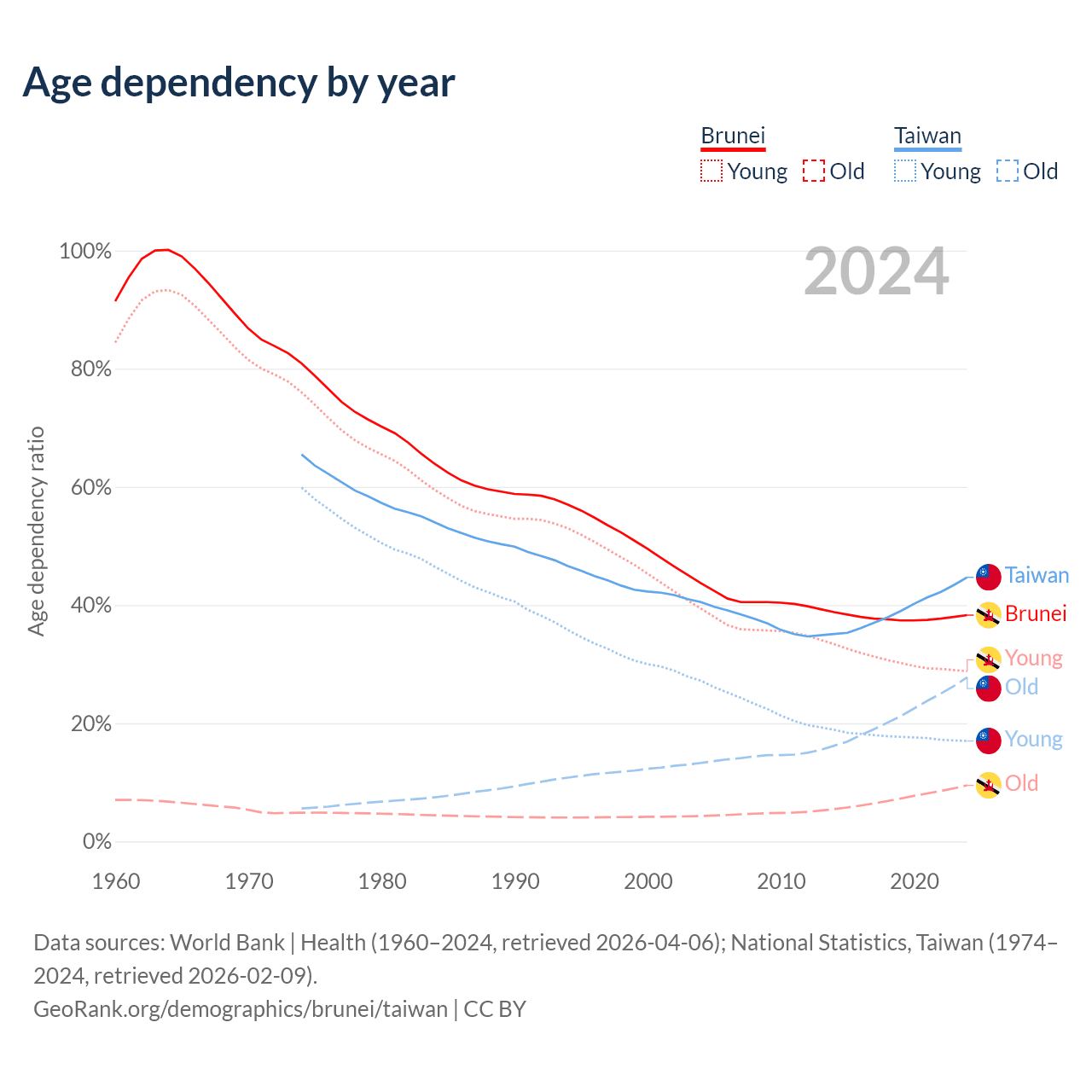 Data sources: World Bank | Health (1960–2024, retrieved 2026-04-06); U.S. Census Bureau (1960–2024, retrieved 2026-02-08); National Statistics, Taiwan (1974–2024, retrieved 2026-02-09).