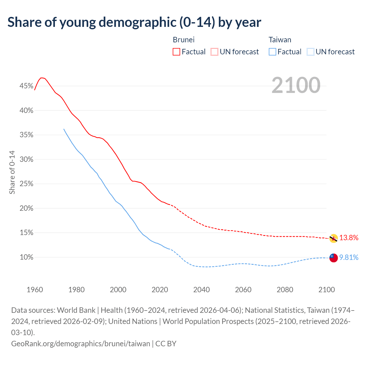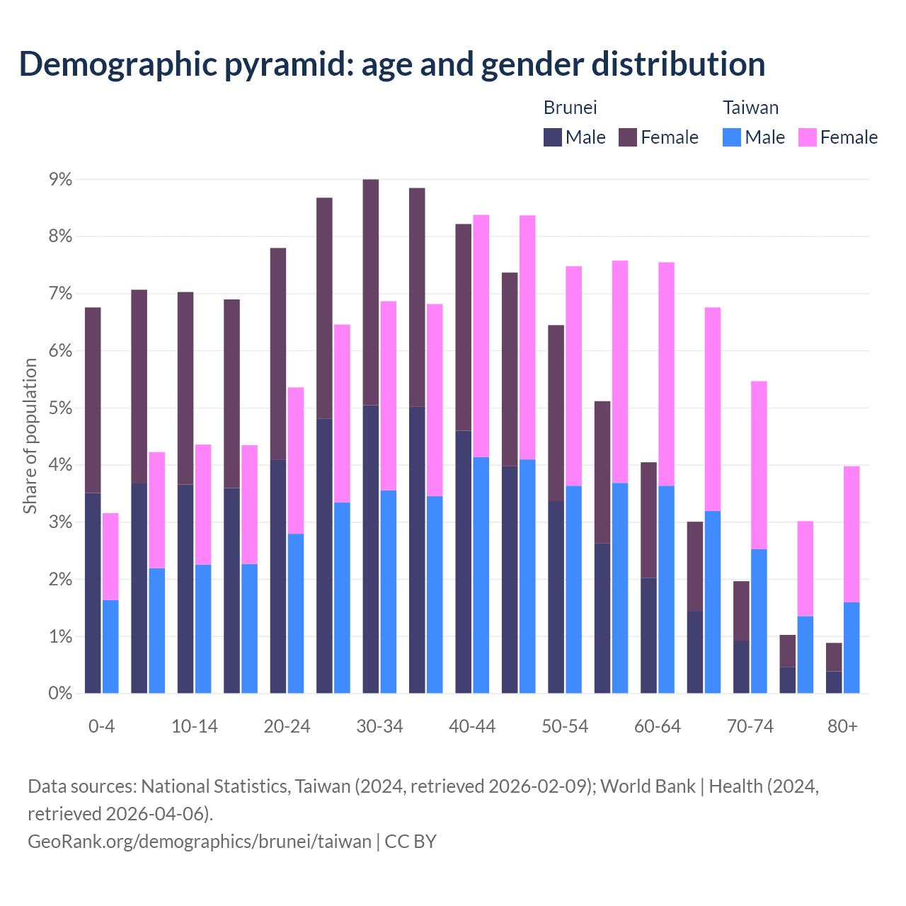- Brunei is ranked 88/196 by median age (oldest to youngest) vs 16/196 for Taiwan.