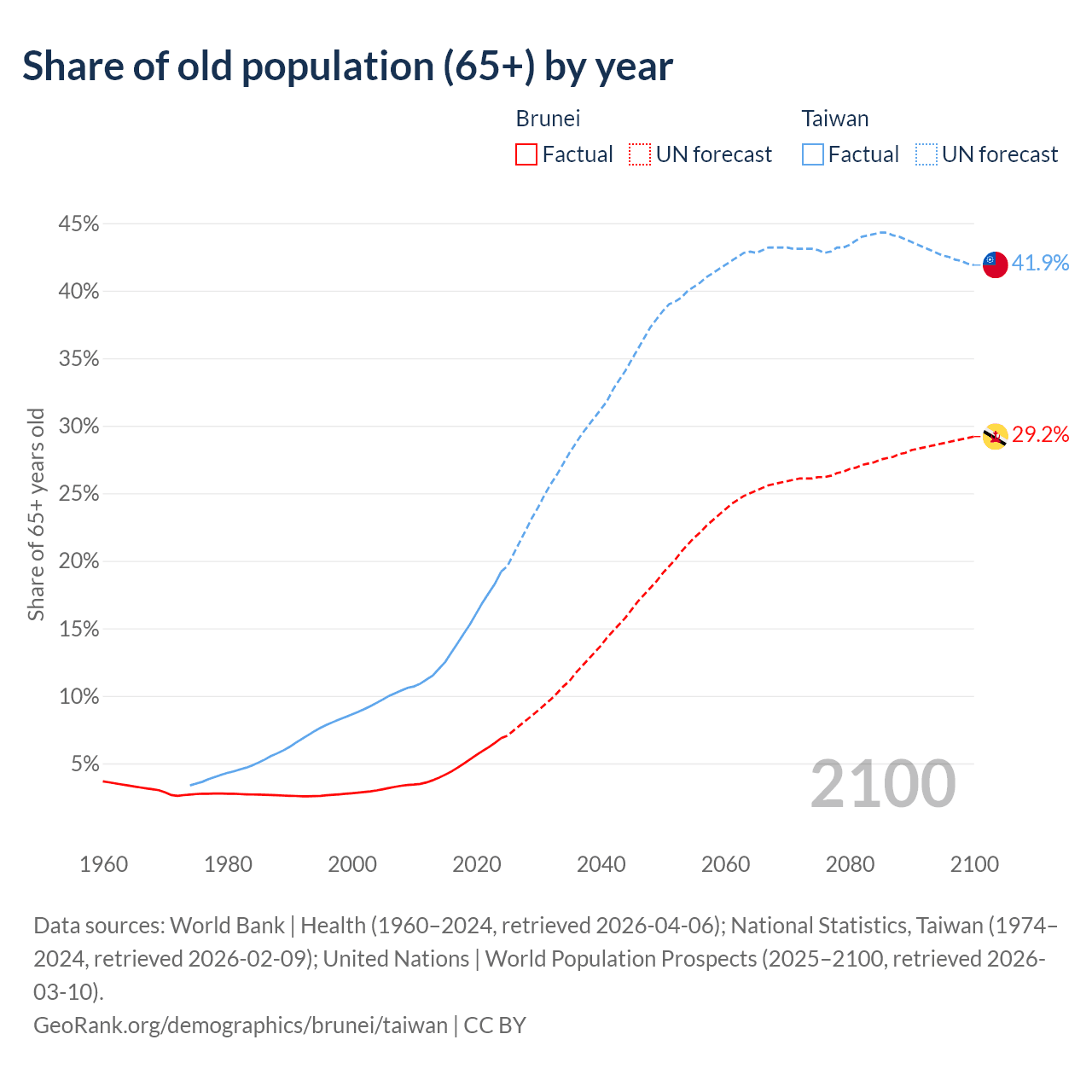 The share of older people aged 65 and over is 6.87% in Brunei and 19.2% in Taiwan. Life expectancy in Brunei compared to Taiwan .
