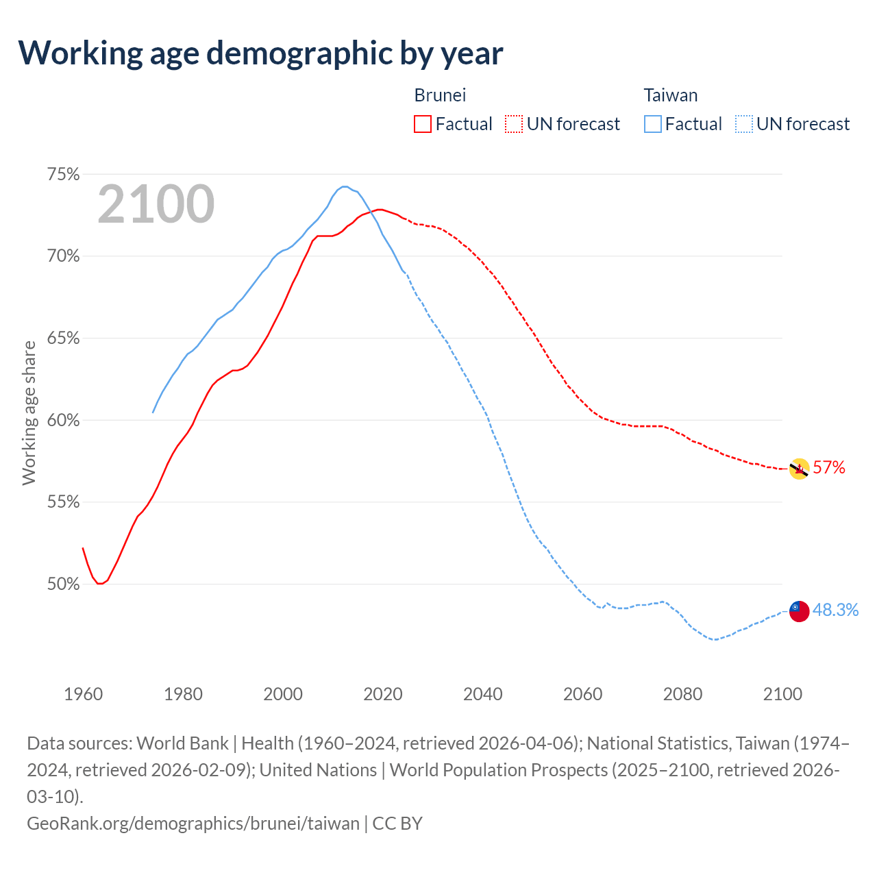 - Brunei has 340K working age adults (aged 15-64) vs 16.1M in Taiwan.