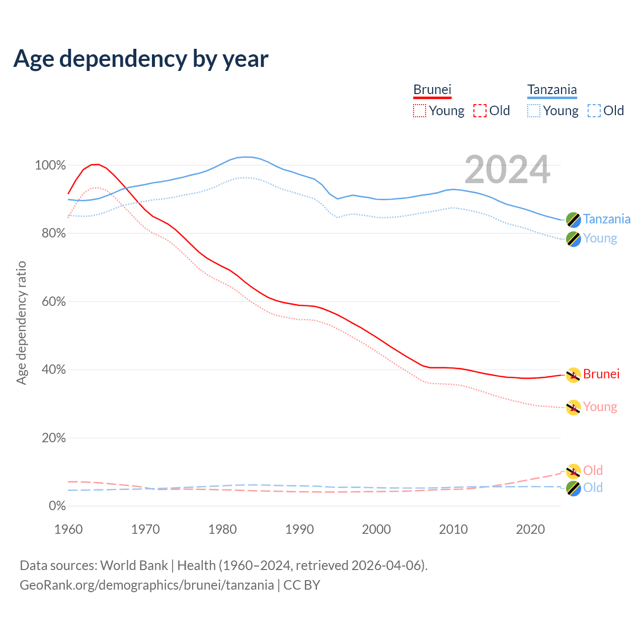- The share of old-age demographic (65+) in Brunei is 6.87% vs 3.05% in Tanzania.