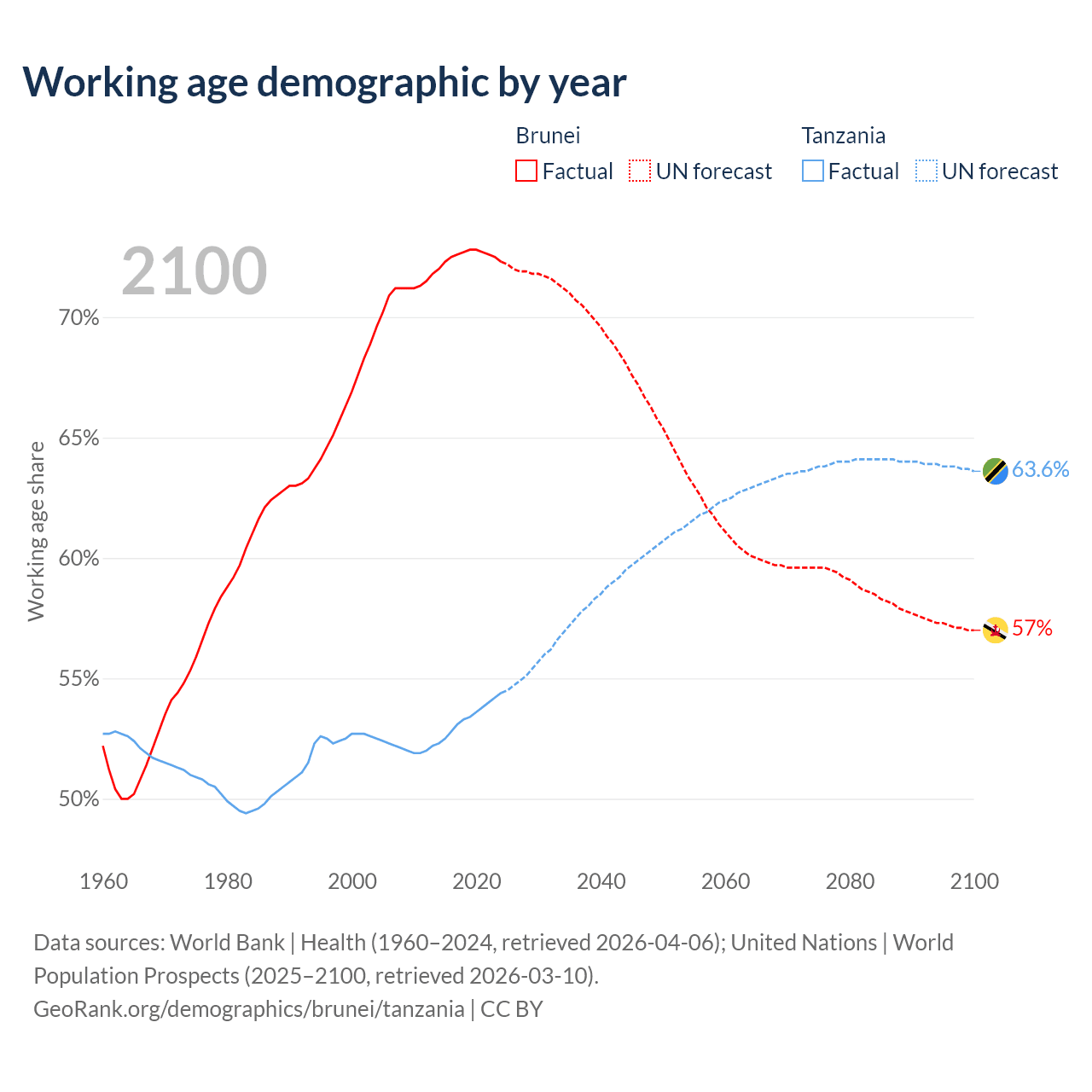 - Brunei has 340K working age adults (aged 15-64) vs 39.8M in Tanzania.