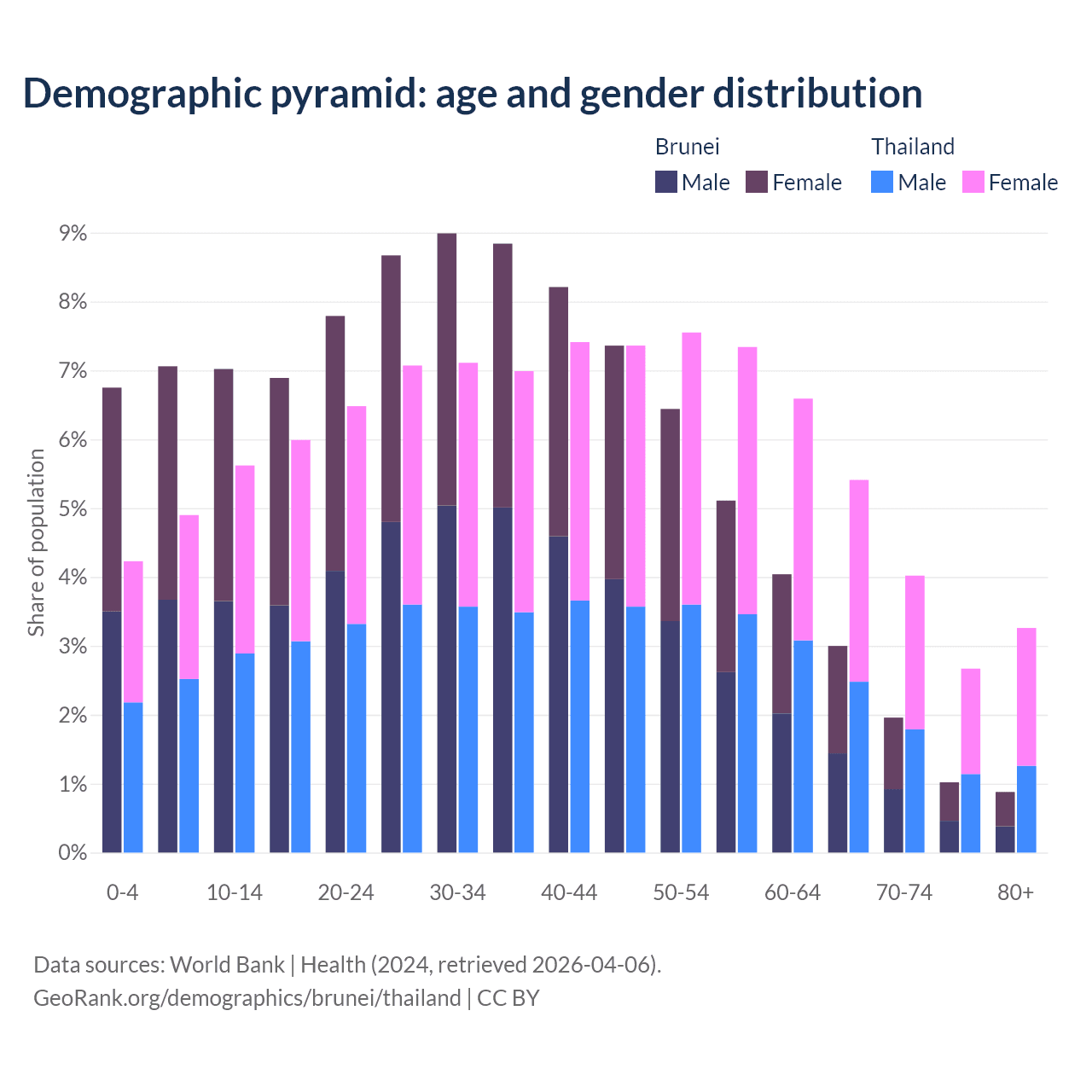 - The median age in Brunei is 33.2 years compared to 41.1 years in Thailand.
