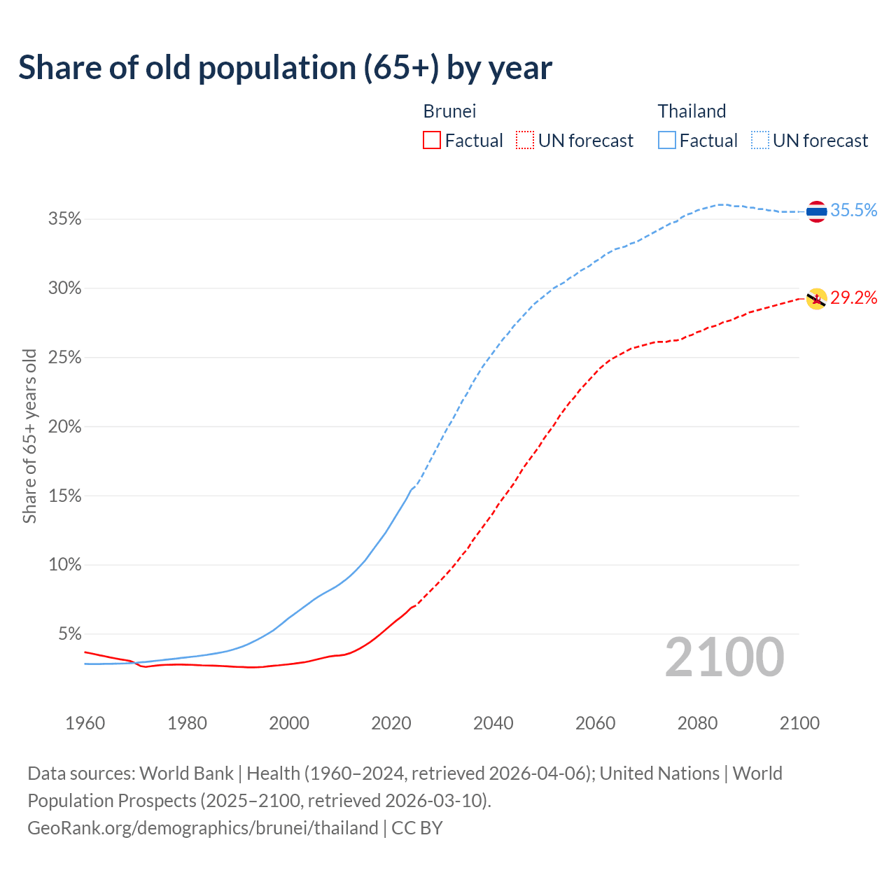 The share of older people aged 65 and over is 6.87% in Brunei and 15.4% in Thailand. Life expectancy in Brunei compared to Thailand .