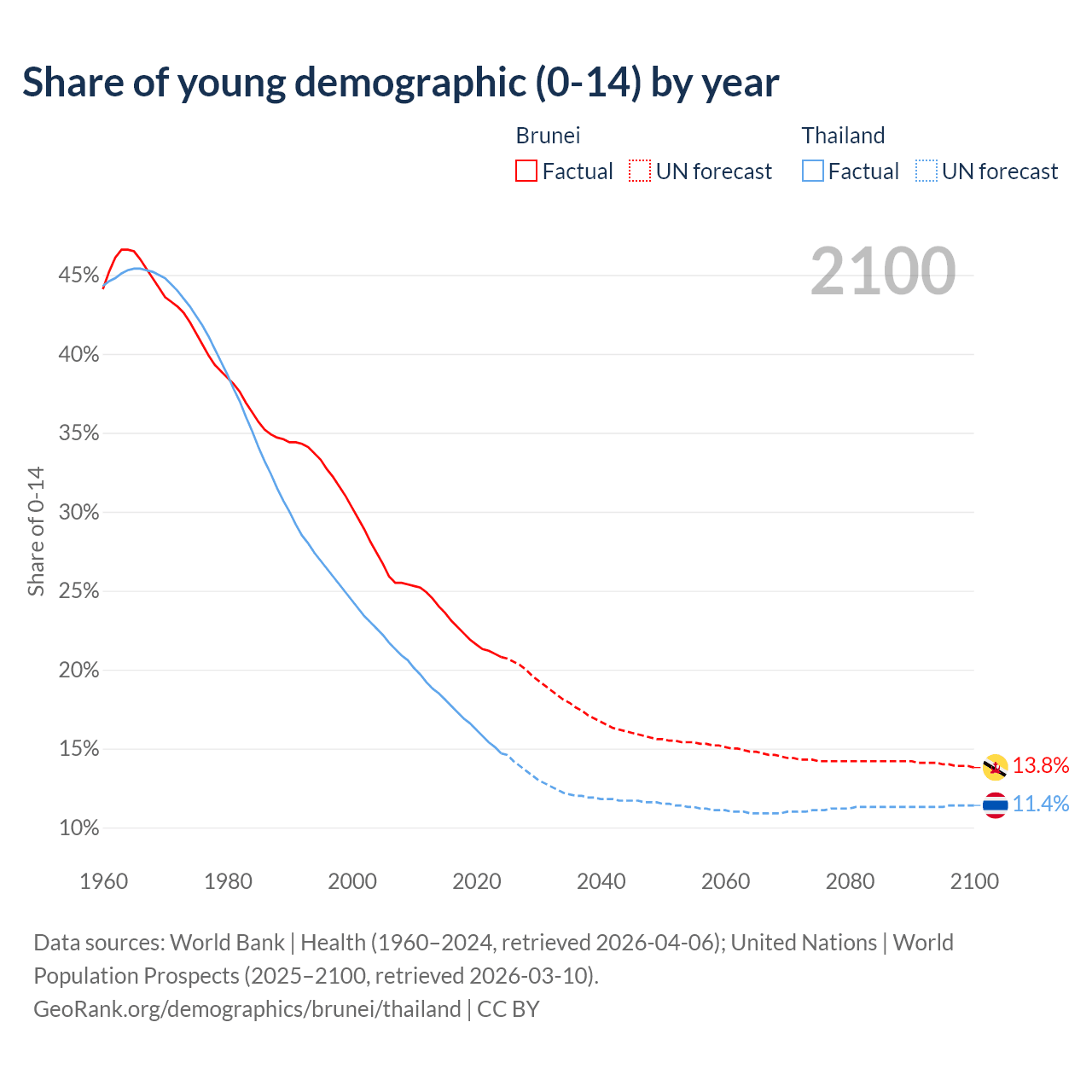 - As of 2026, the population of Brunei is 471K vs 71.6M in Thailand - 152 times difference.