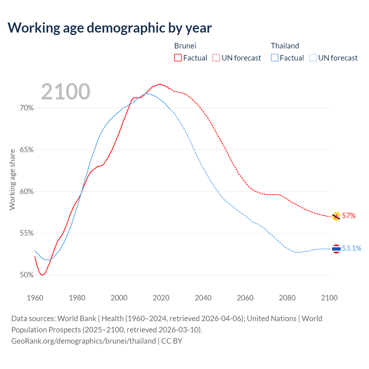 - Brunei is ranked 88/196 by median age (oldest to youngest) vs 40/196 for Thailand.