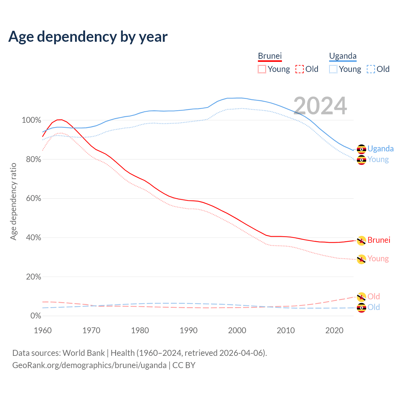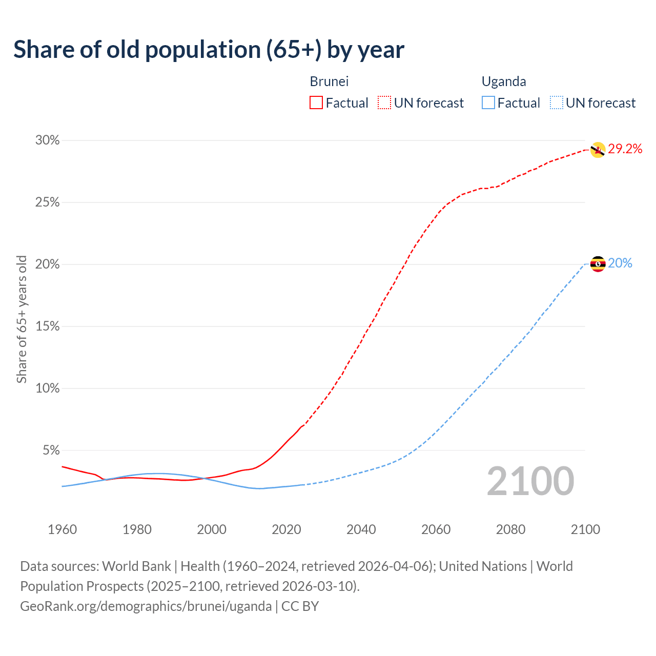 - The share of old-age demographic (65+) in Brunei is 6.87% vs 2.19% in Uganda.