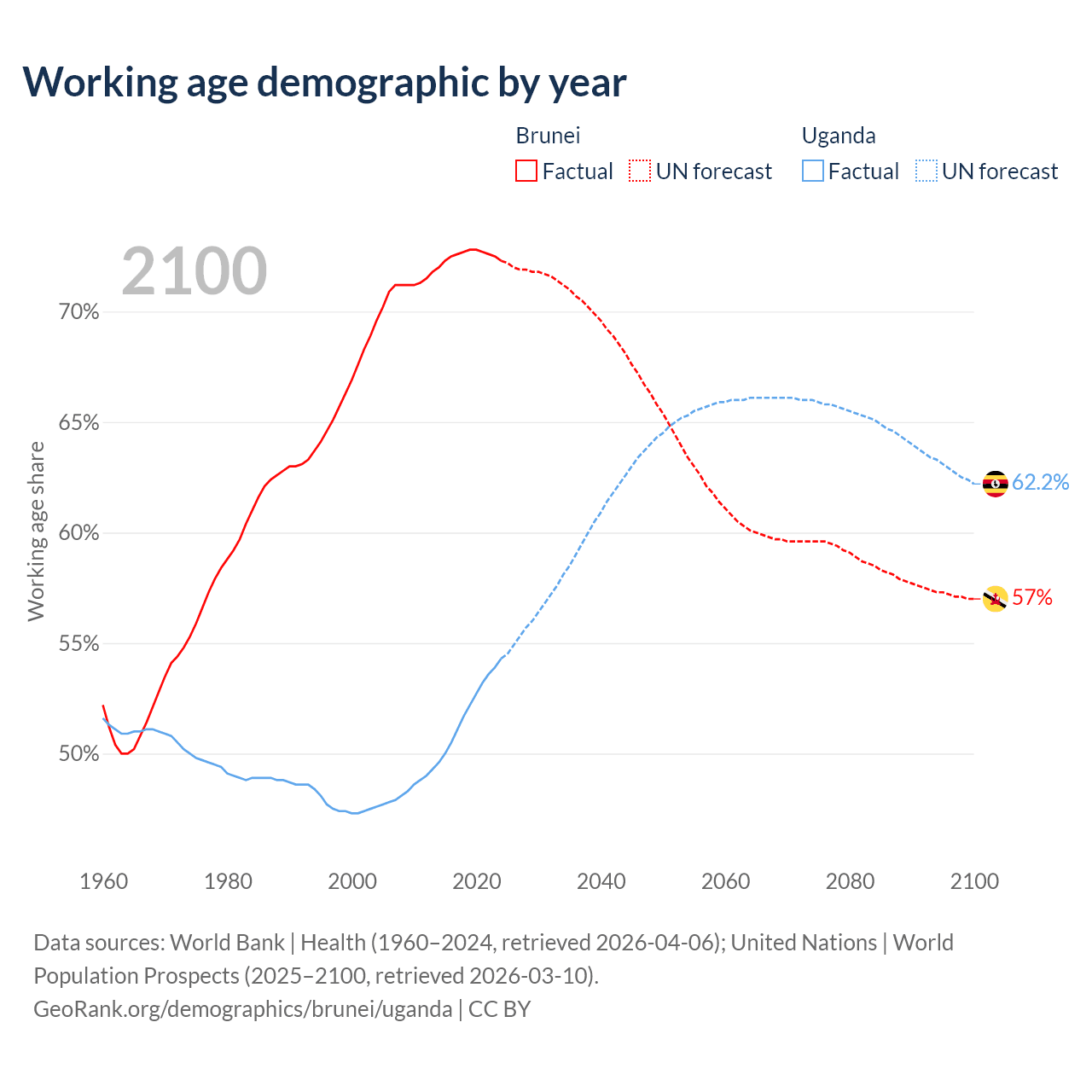 Median age Brunei vs Uganda, 1960-2100