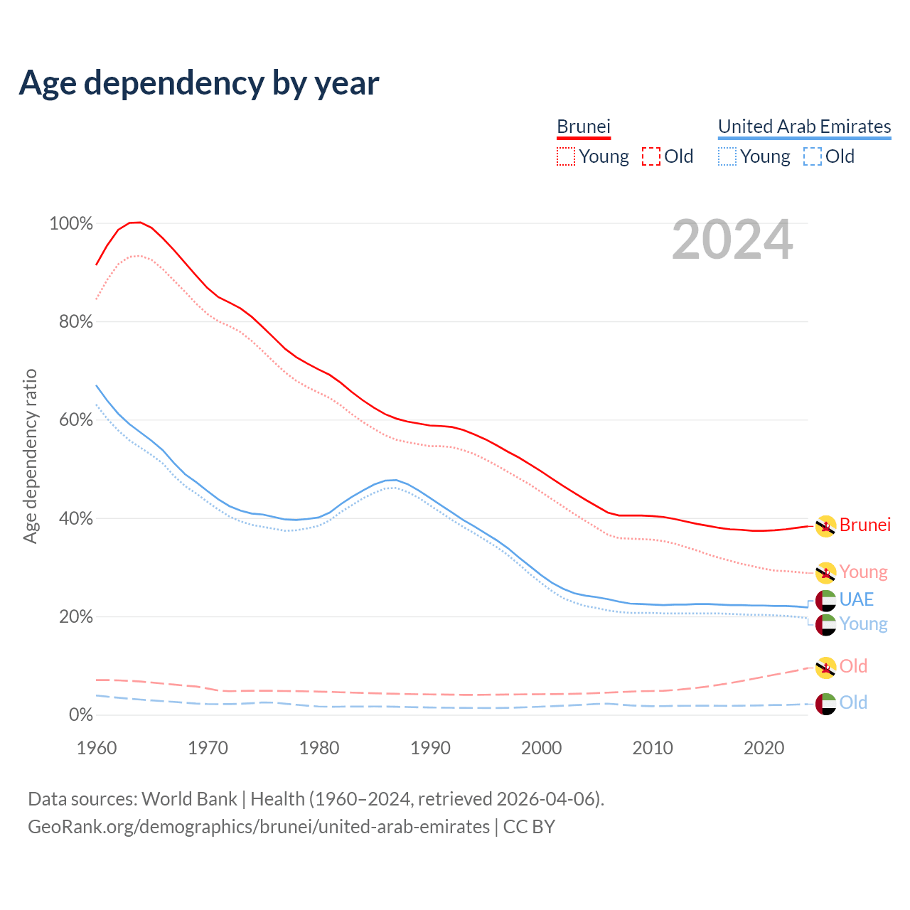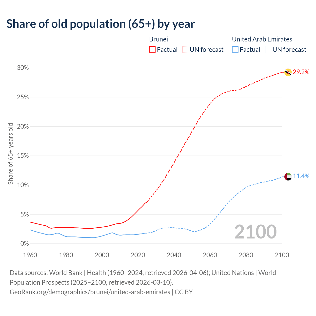 - The share of old-age demographic (65+) in Brunei is 6.87% vs 1.77% in the United Arab Emirates.
