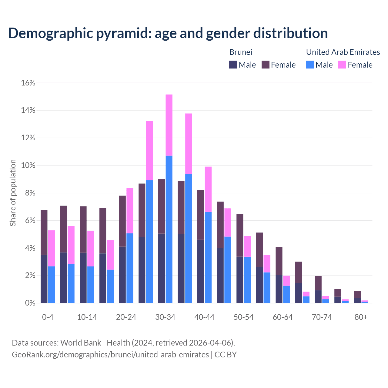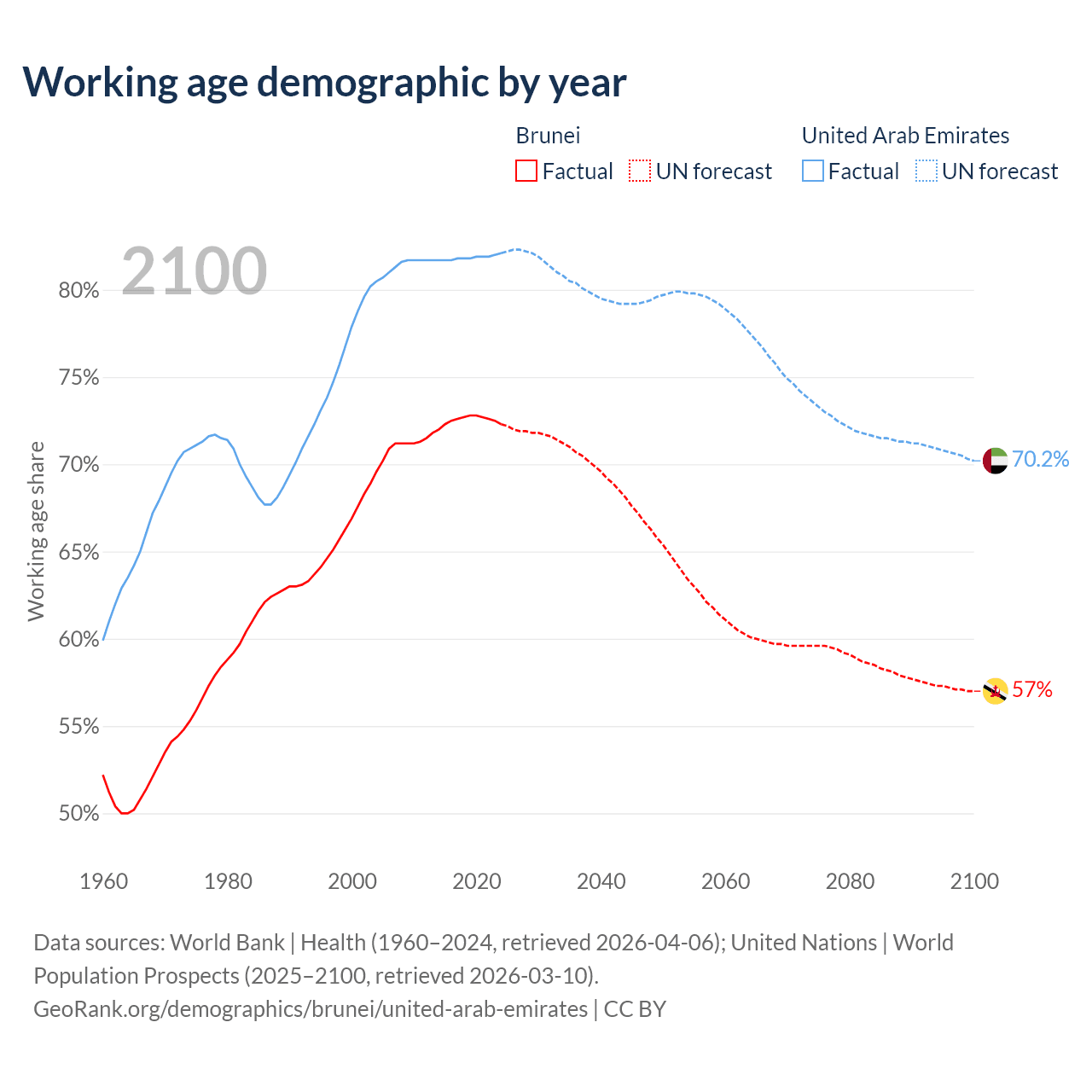 The share of older people aged 65 and over is 6.87% in Brunei and 1.77% in the United Arab Emirates. Life expectancy in Brunei compared to the United Arab Emirates .
