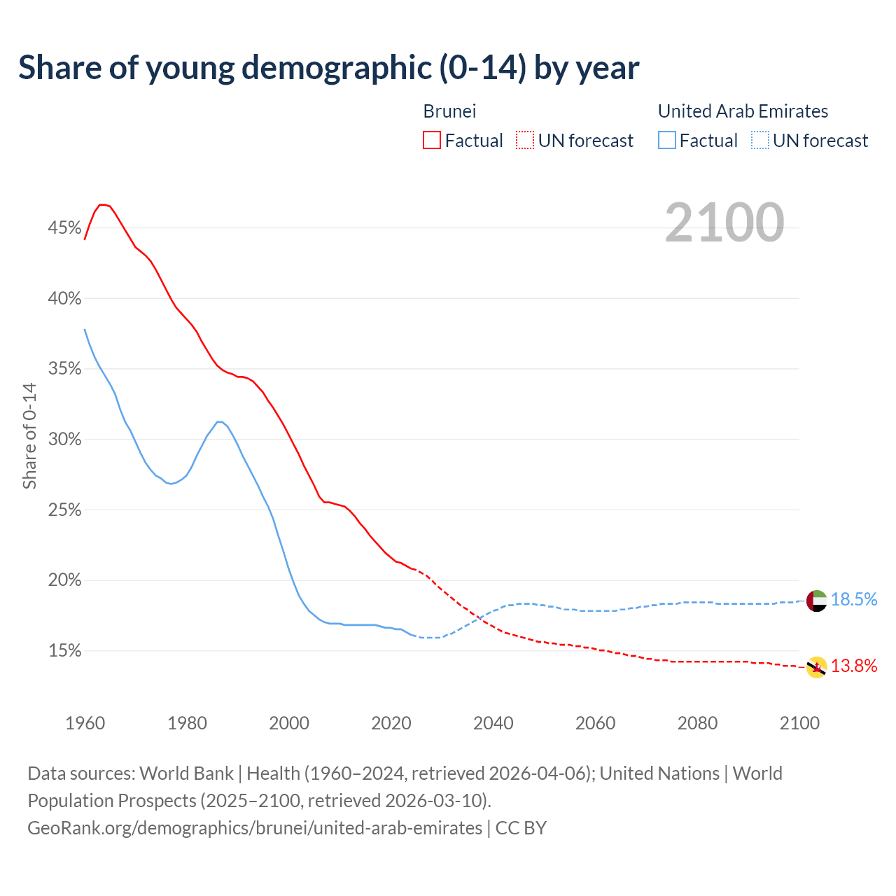 - The share of young demographic (0-15 years old) in Brunei is 20.8% vs 16.1% in the United Arab Emirates.