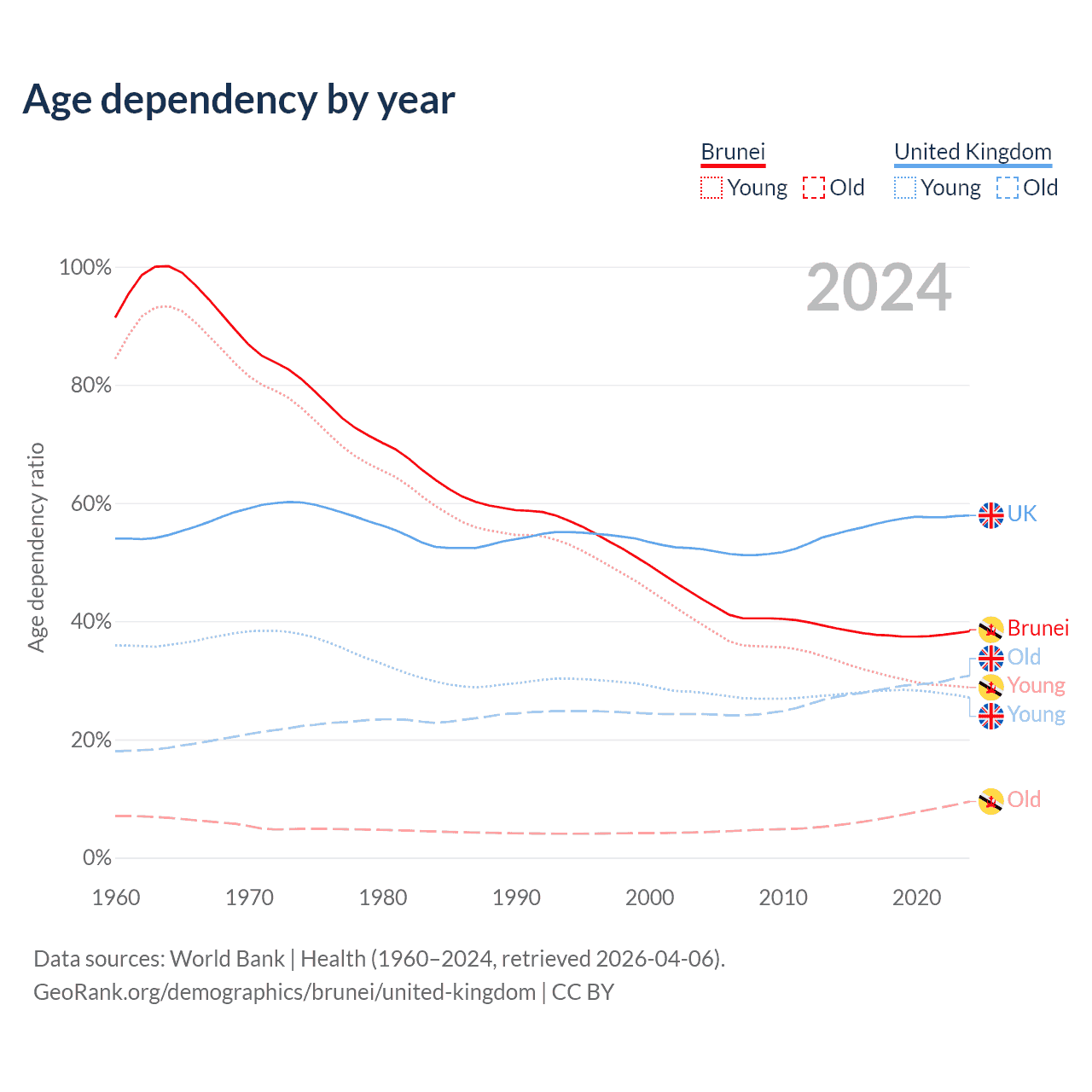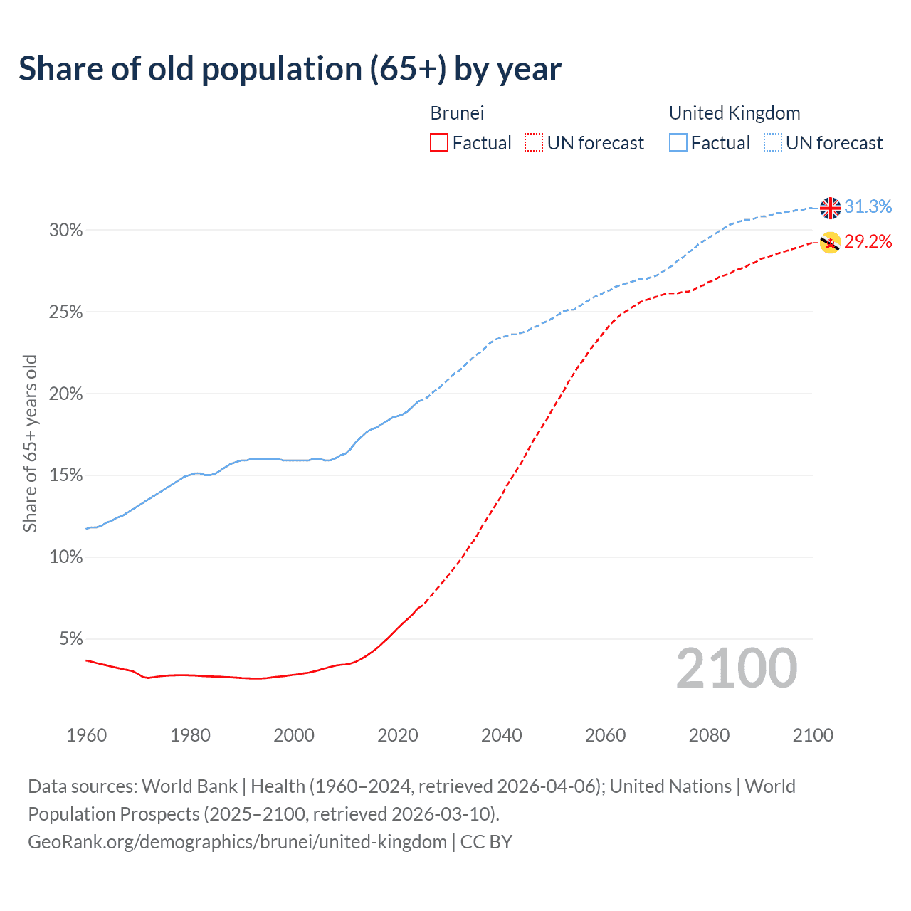- The share of old-age demographic (65+) in Brunei is 6.87% vs 19.5% in the United Kingdom.