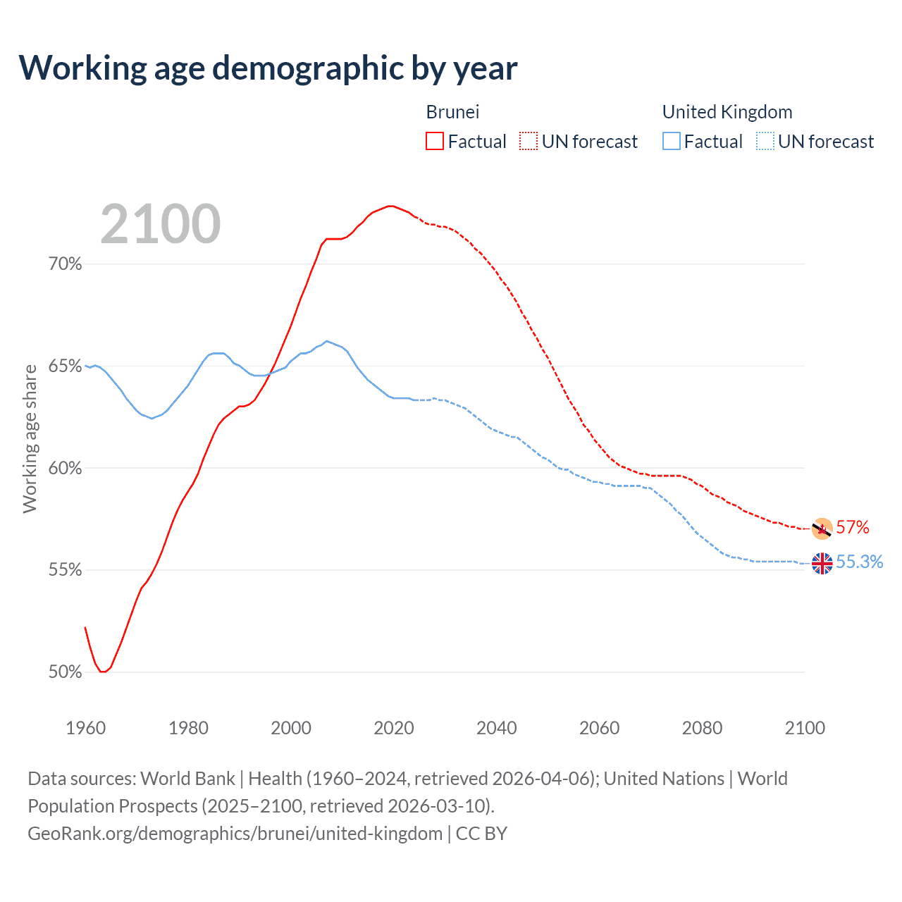 - Brunei has 340K working age adults (aged 15-64) vs 44.4M in the United Kingdom.
