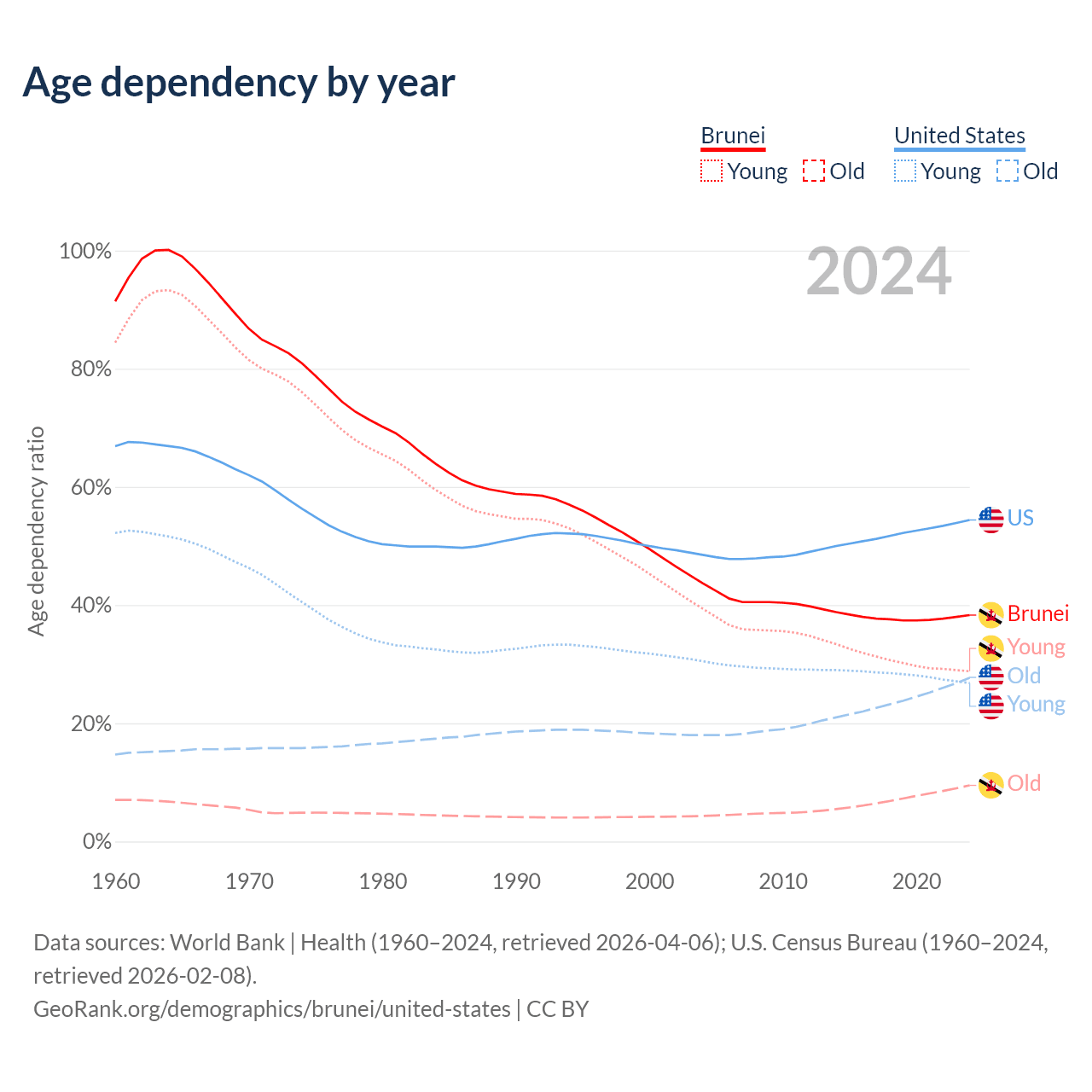 - The share of old-age demographic (65+) in Brunei is 6.87% vs 17.9% in the United States.