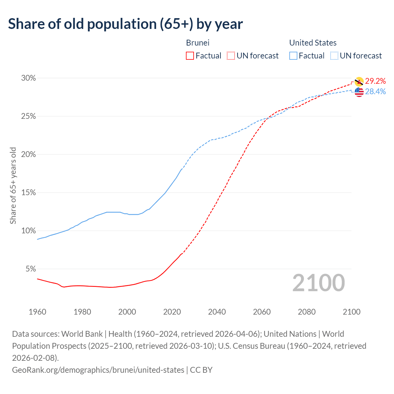 The share of older people aged 65 and over is 6.87% in Brunei and 17.9% in the United States. Life expectancy in Brunei compared to the United States .