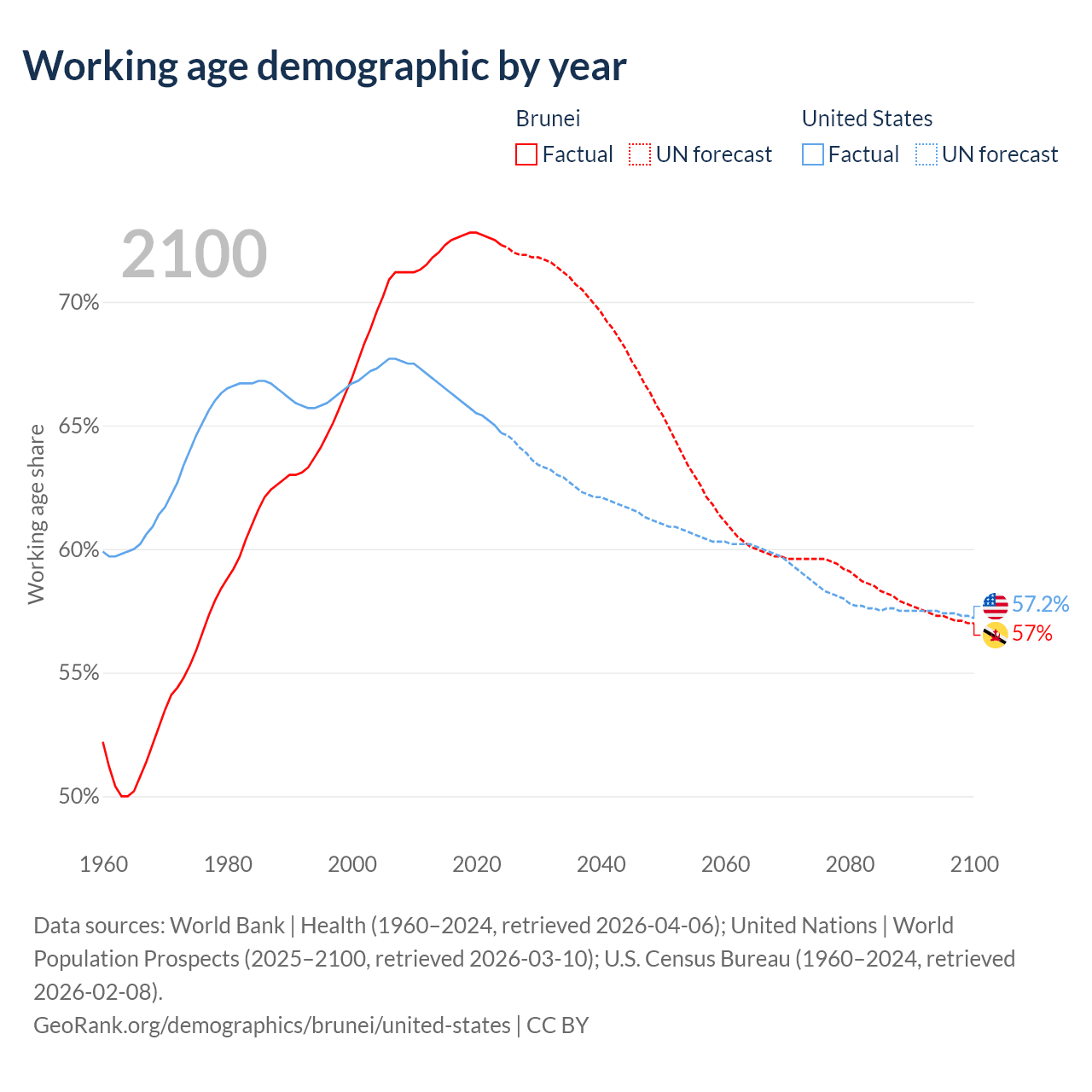 Median age Brunei vs United States, 1960-2100