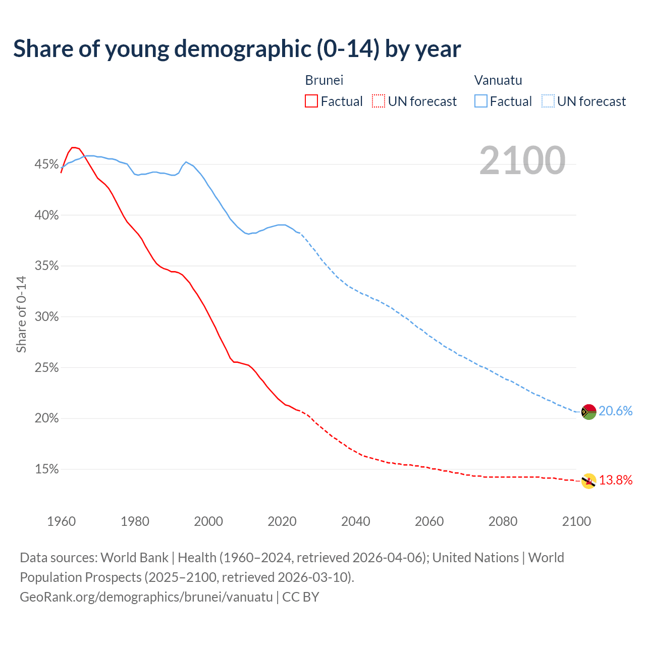 - The share of young demographic (0-15 years old) in Brunei is 20.8% vs 38.3% in Vanuatu.