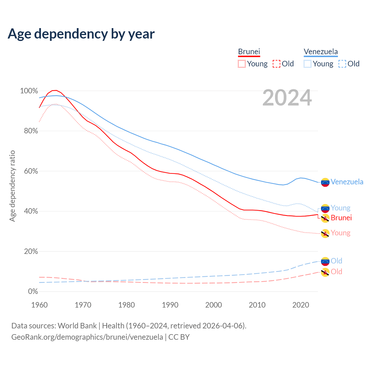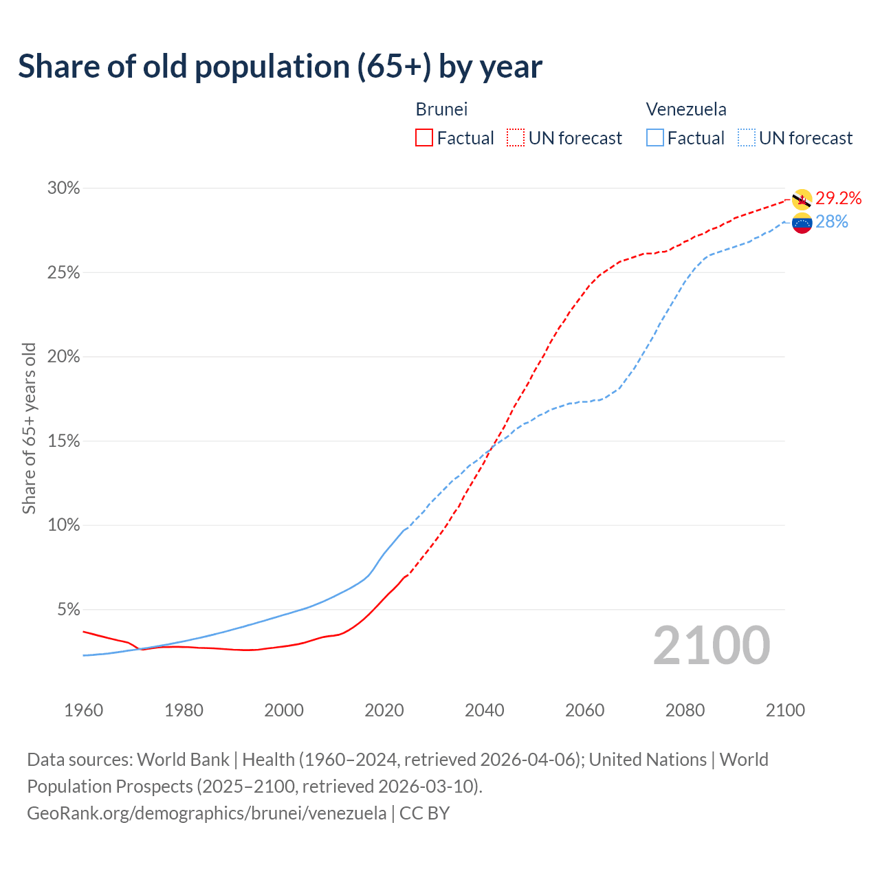 - The share of old-age demographic (65+) in Brunei is 6.87% vs 9.68% in Venezuela.