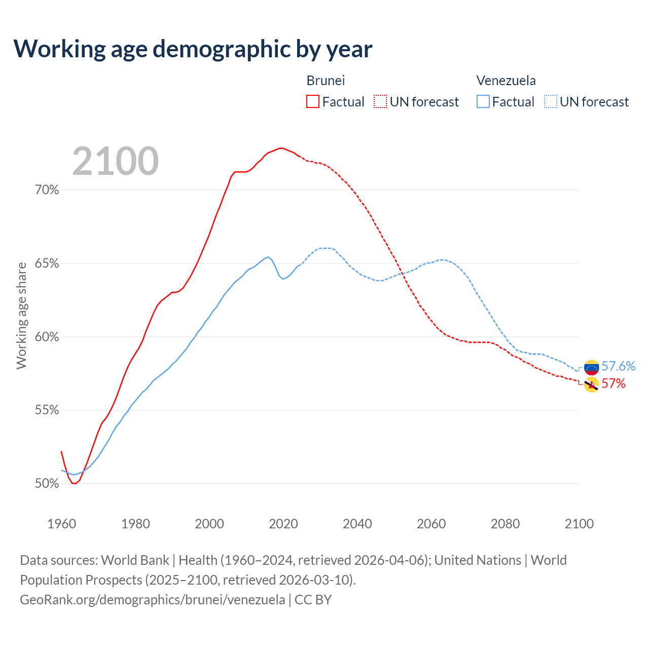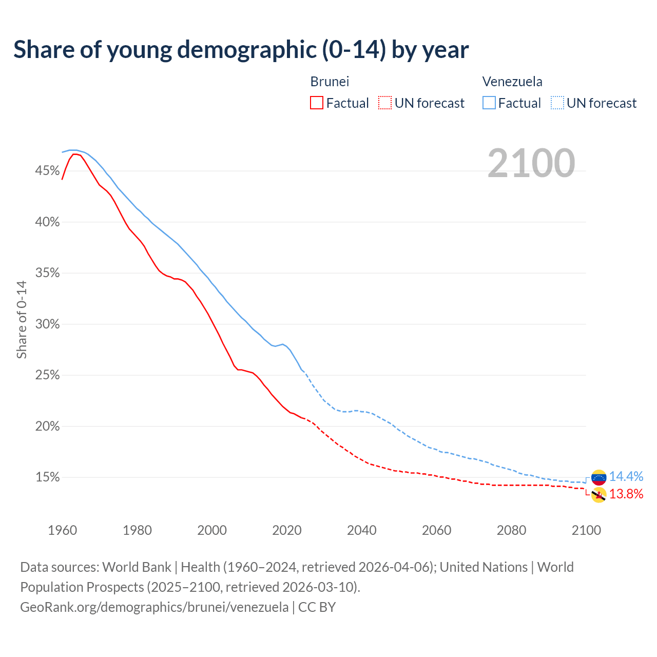 - The share of young demographic (0-15 years old) in Brunei is 20.8% vs 25.5% in Venezuela.
