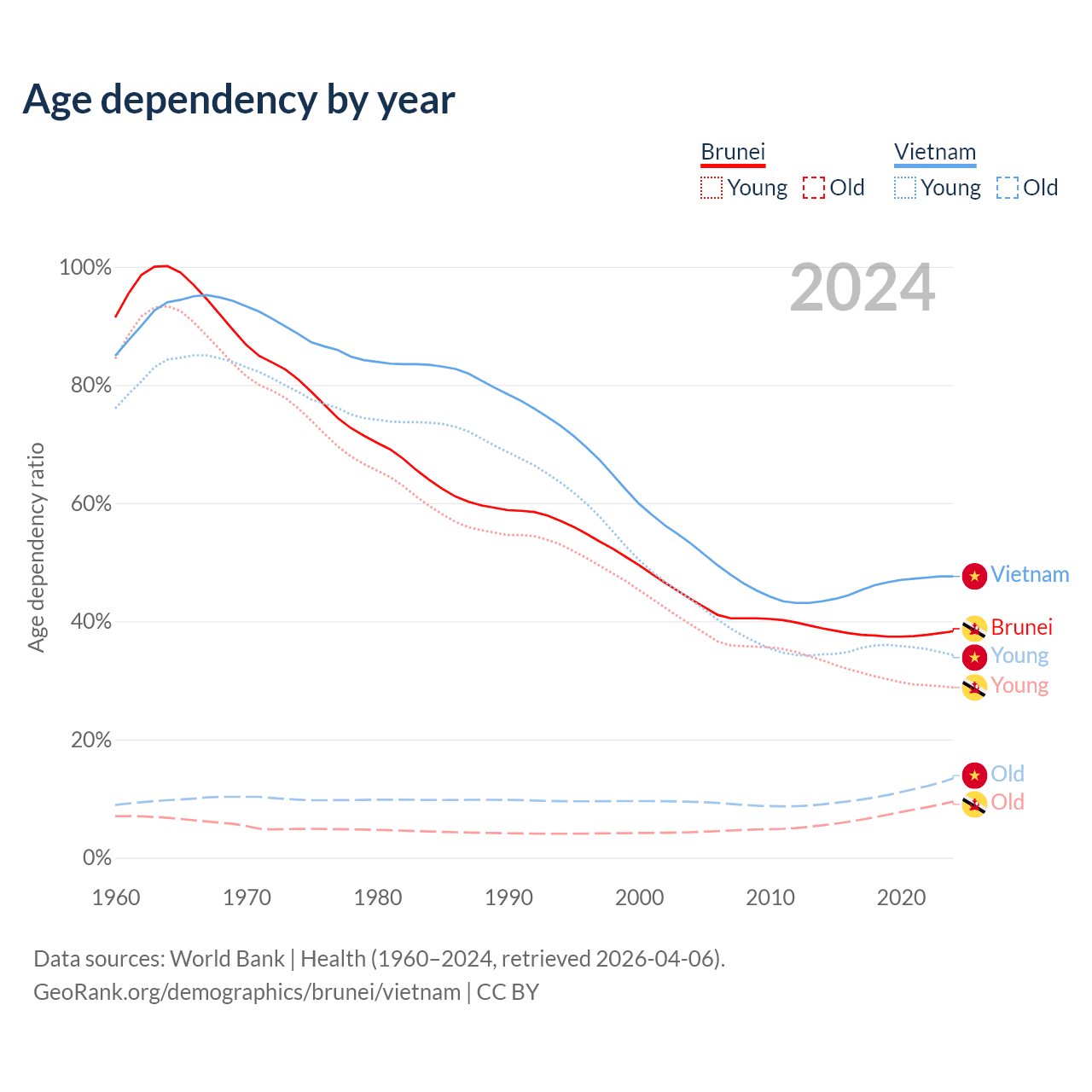 Data sources: World Bank | Health (1960–2024, retrieved 2026-04-06); U.S. Census Bureau (1960–2024, retrieved 2026-02-08).