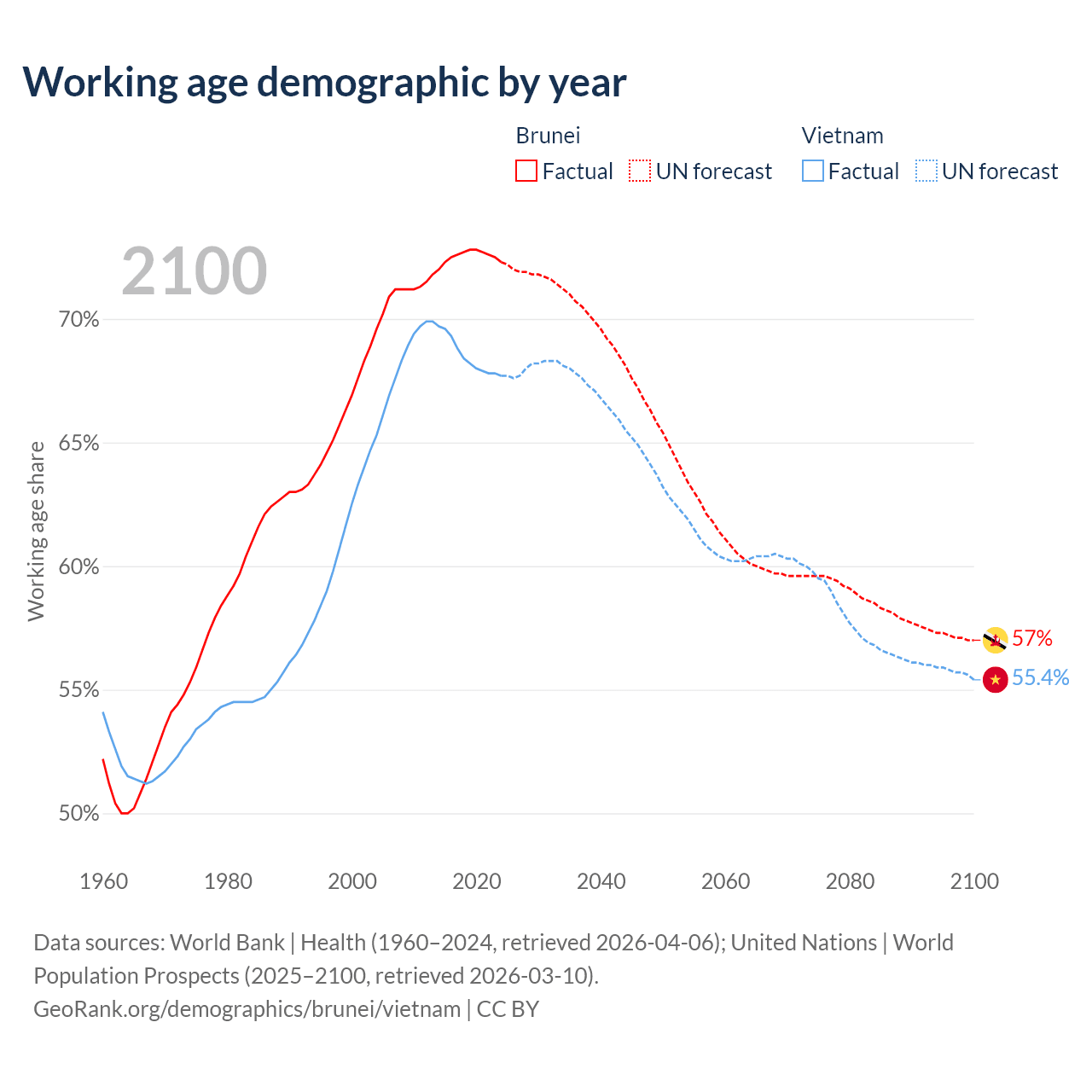 - Brunei has 340K working age adults (aged 15-64) vs 69.3M in Vietnam.