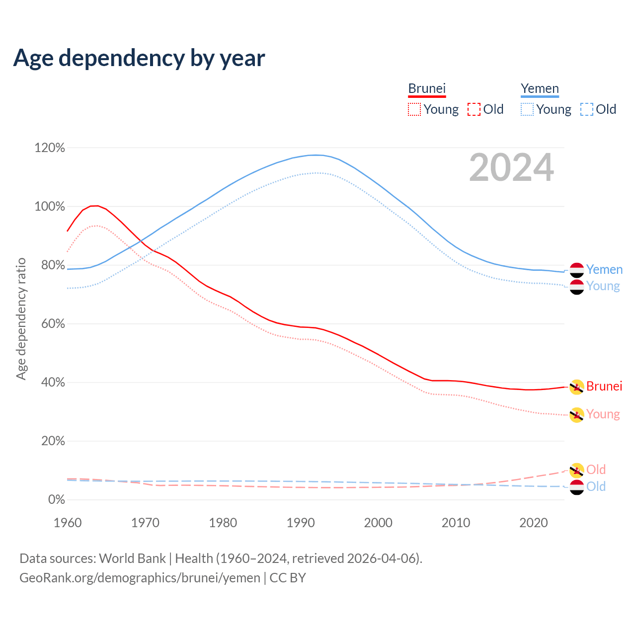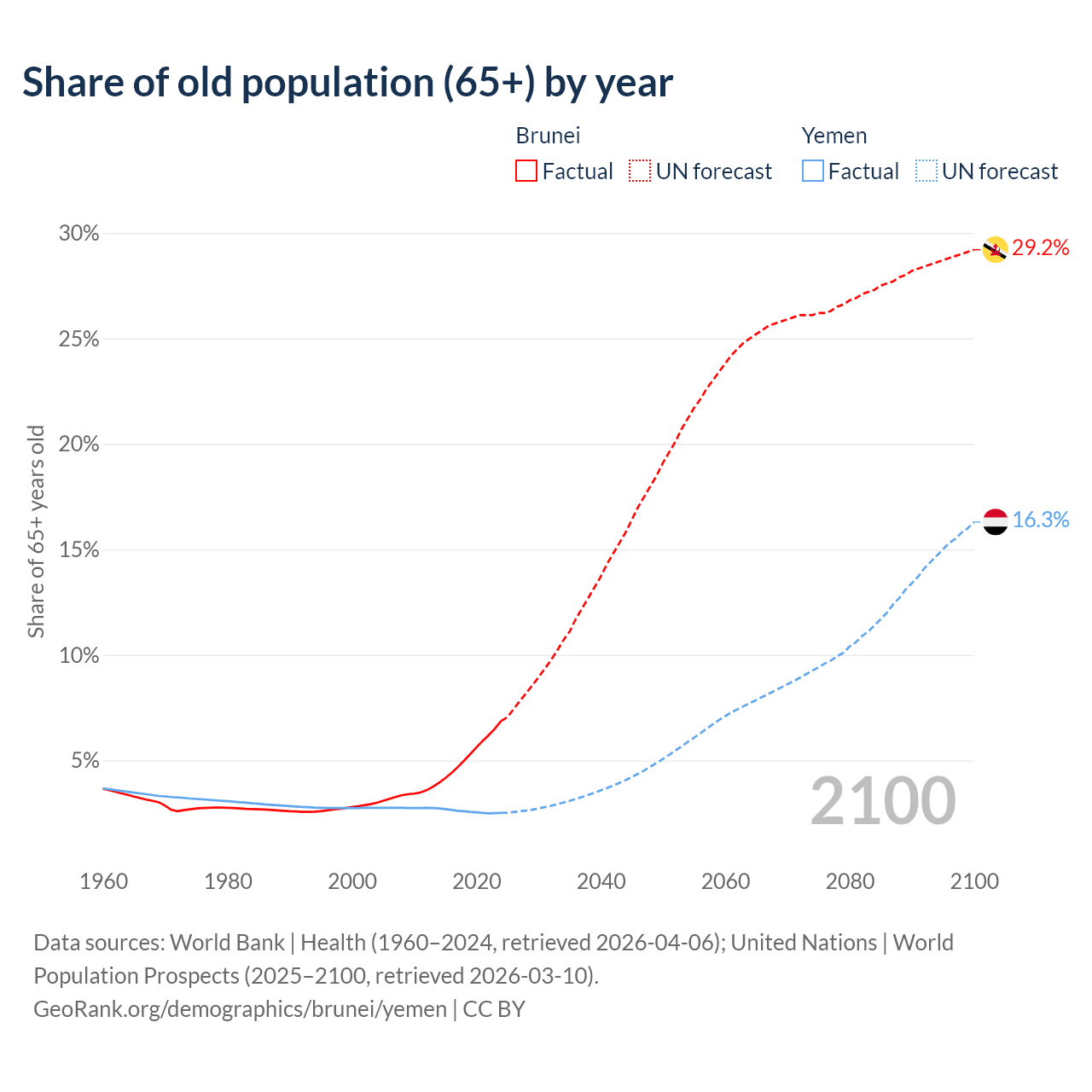 - The share of old-age demographic (65+) in Brunei is 6.87% vs 2.52% in Yemen.