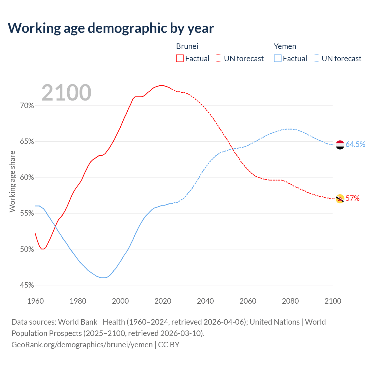 - Brunei has 340K working age adults (aged 15-64) vs 24.4M in Yemen.
