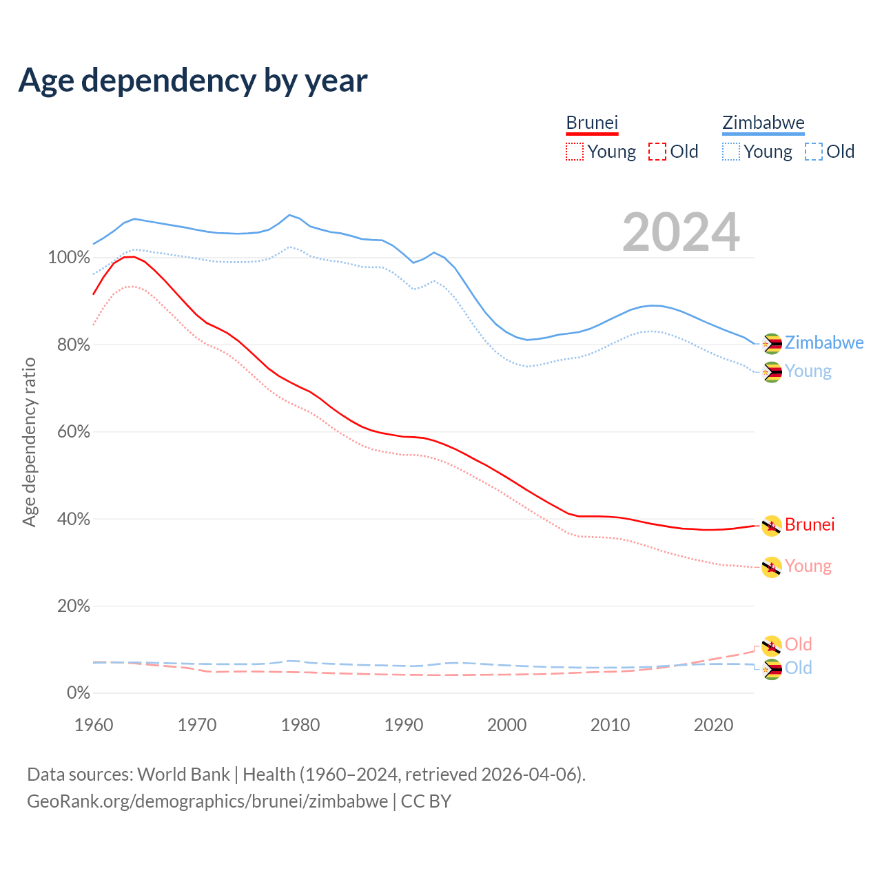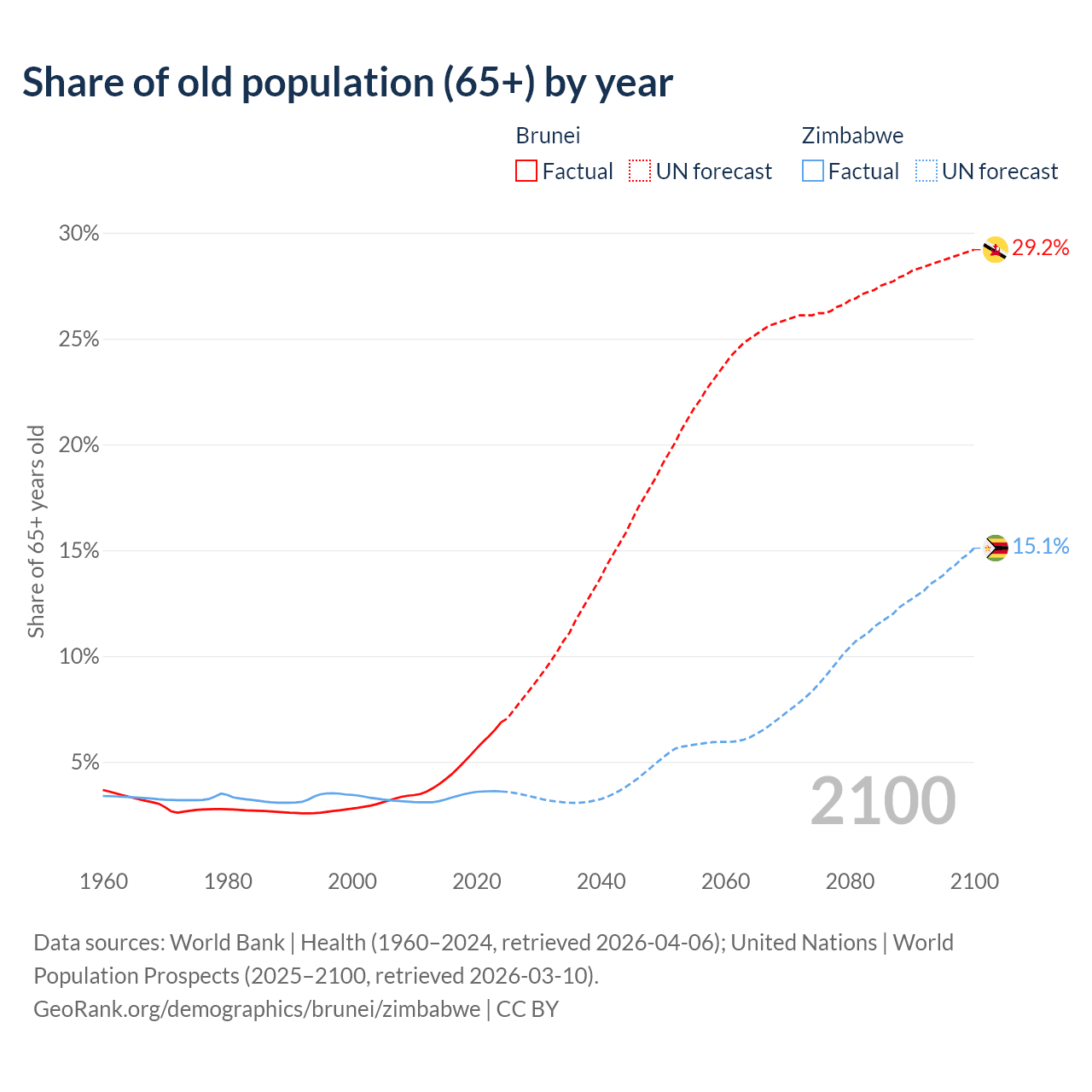 - The share of old-age demographic (65+) in Brunei is 6.87% vs 3.6% in Zimbabwe.