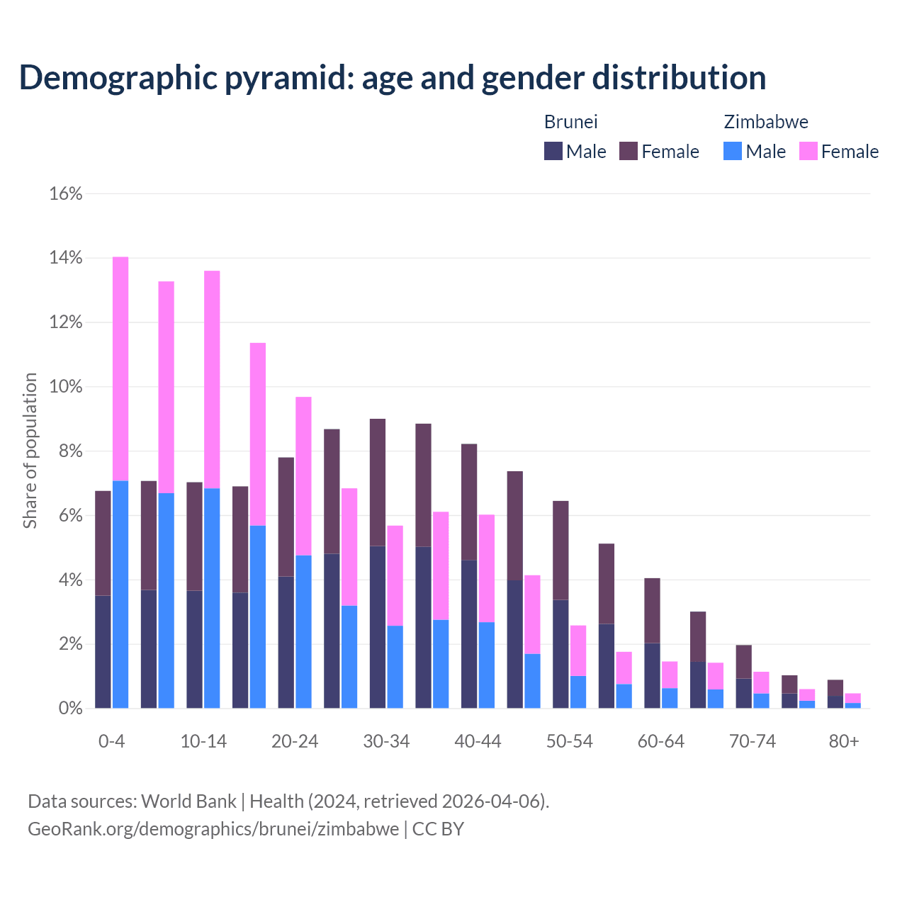 The share of older people aged 65 and over is 6.87% in Brunei and 3.6% in Zimbabwe. Life expectancy in Brunei compared to Zimbabwe .