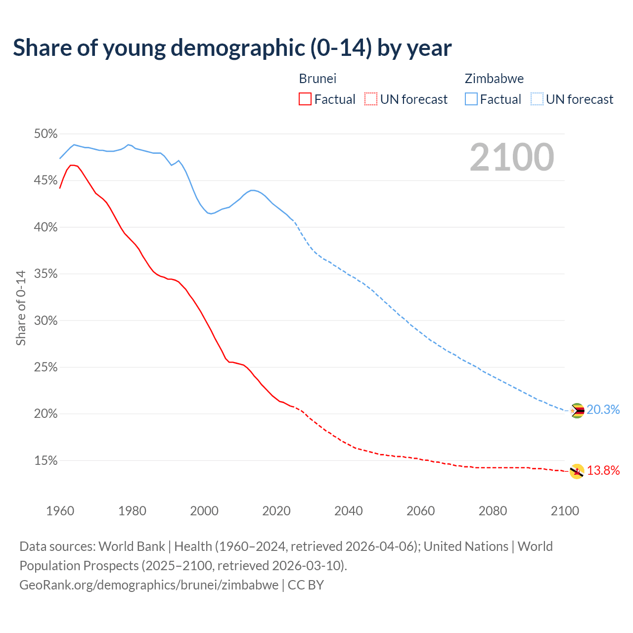 - The share of young demographic (0-15 years old) in Brunei is 20.8% vs 40.9% in Zimbabwe.
