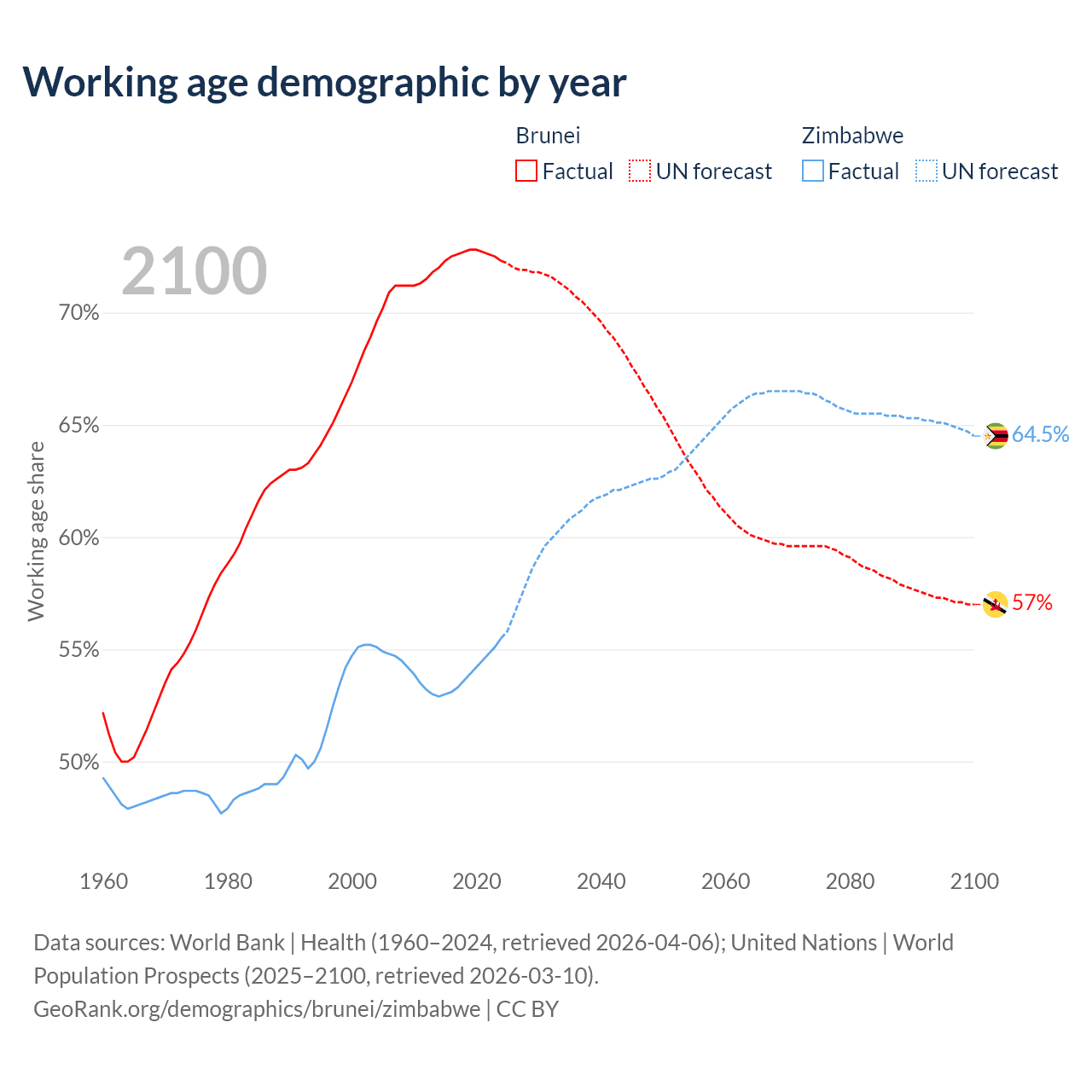 - Brunei has 340K working age adults (aged 15-64) vs 9.64M in Zimbabwe.