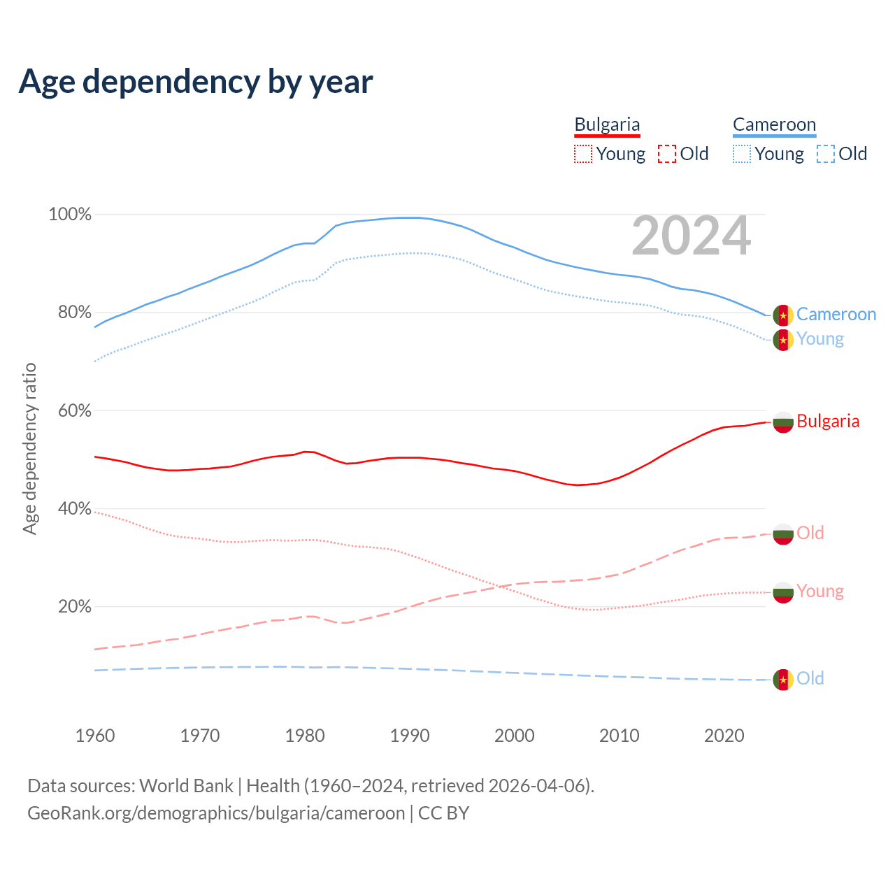 Data sources: World Bank | Health (1960–2024, retrieved 2026-04-06); U.S. Census Bureau (1960–2024, retrieved 2026-02-08).