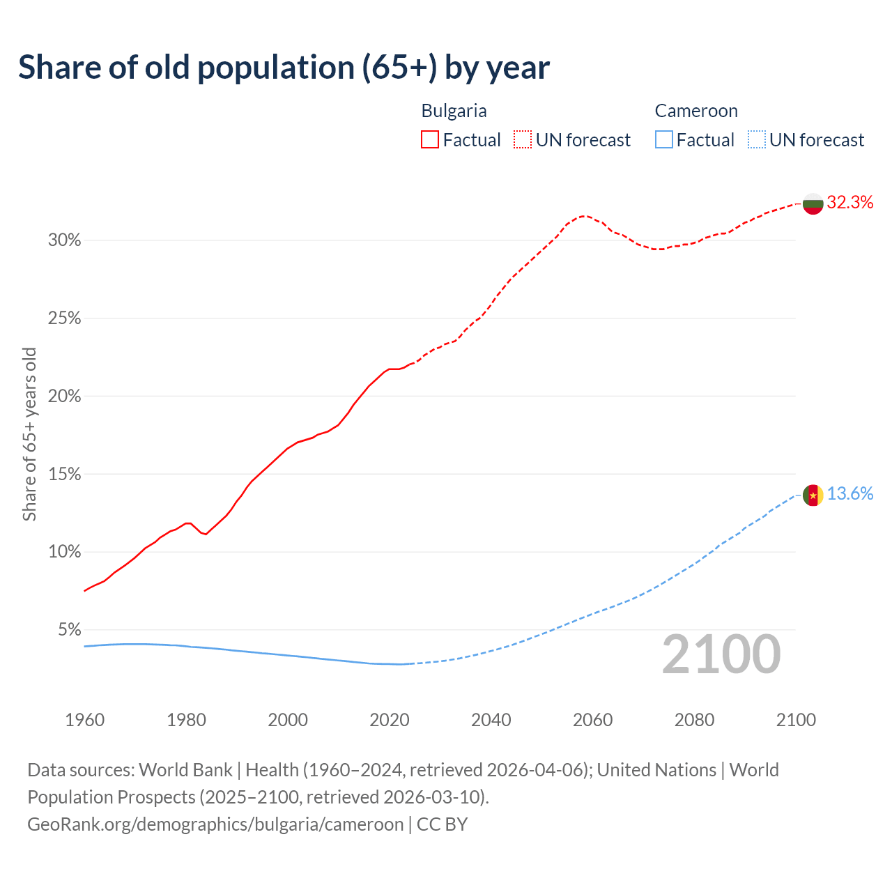 The share of older people aged 65 and over is 22% in Bulgaria and 2.79% in Cameroon. Life expectancy in Bulgaria compared to Cameroon .