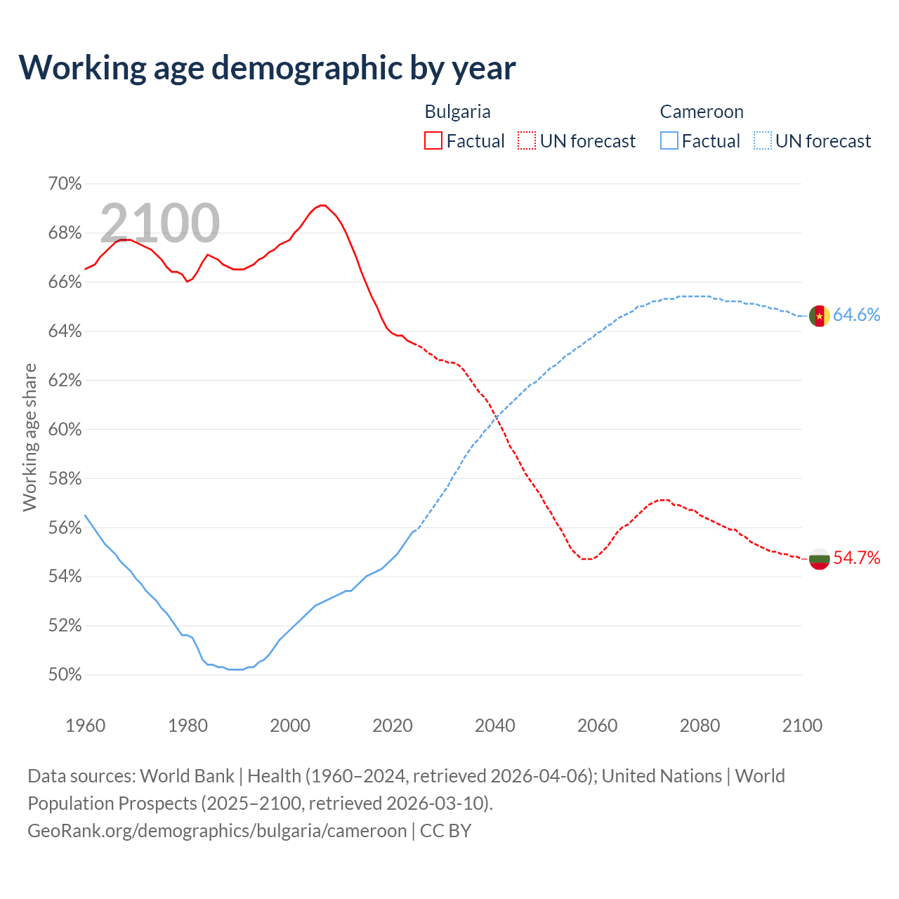 Median age Bulgaria vs Cameroon, 1960-2100