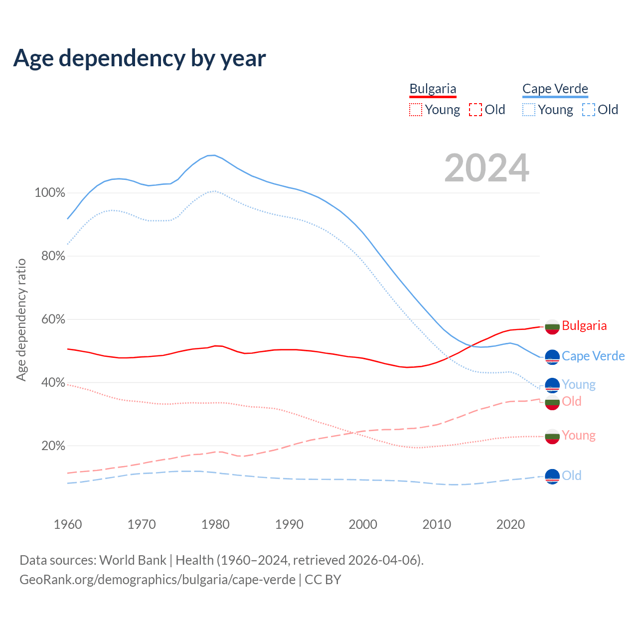 - Bulgaria is ranked 12/196 by median age (oldest to youngest) vs 110/196 for Cape Verde.
