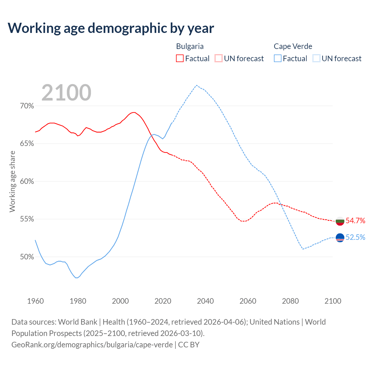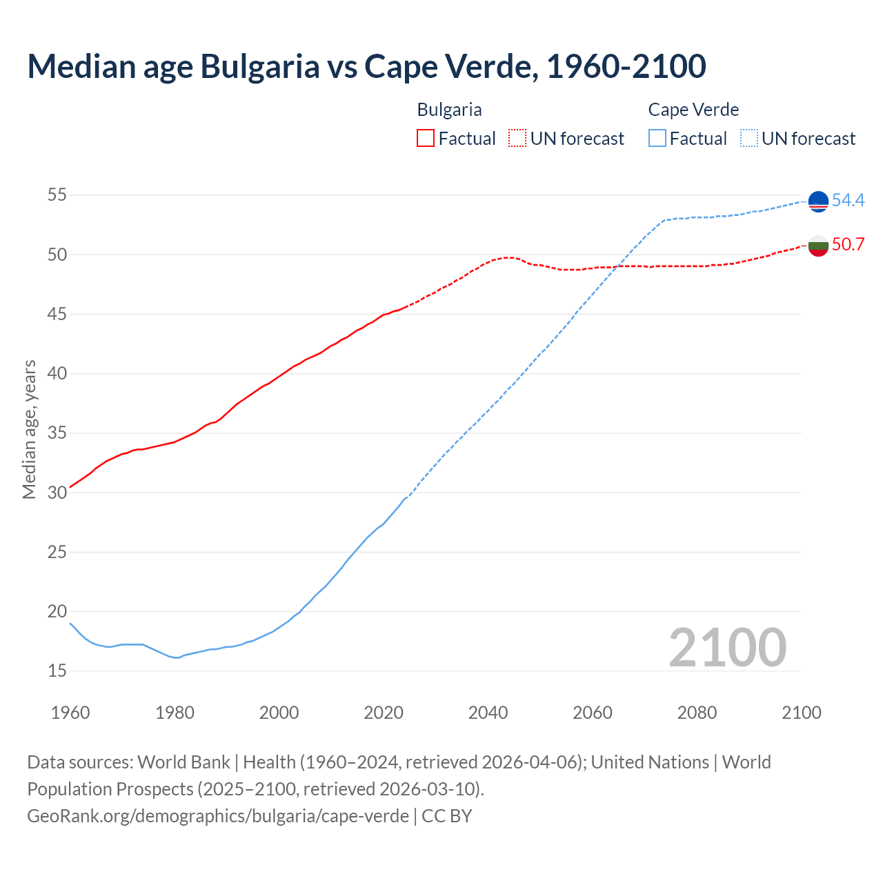 Median age Bulgaria vs Cape Verde, 1960-2100