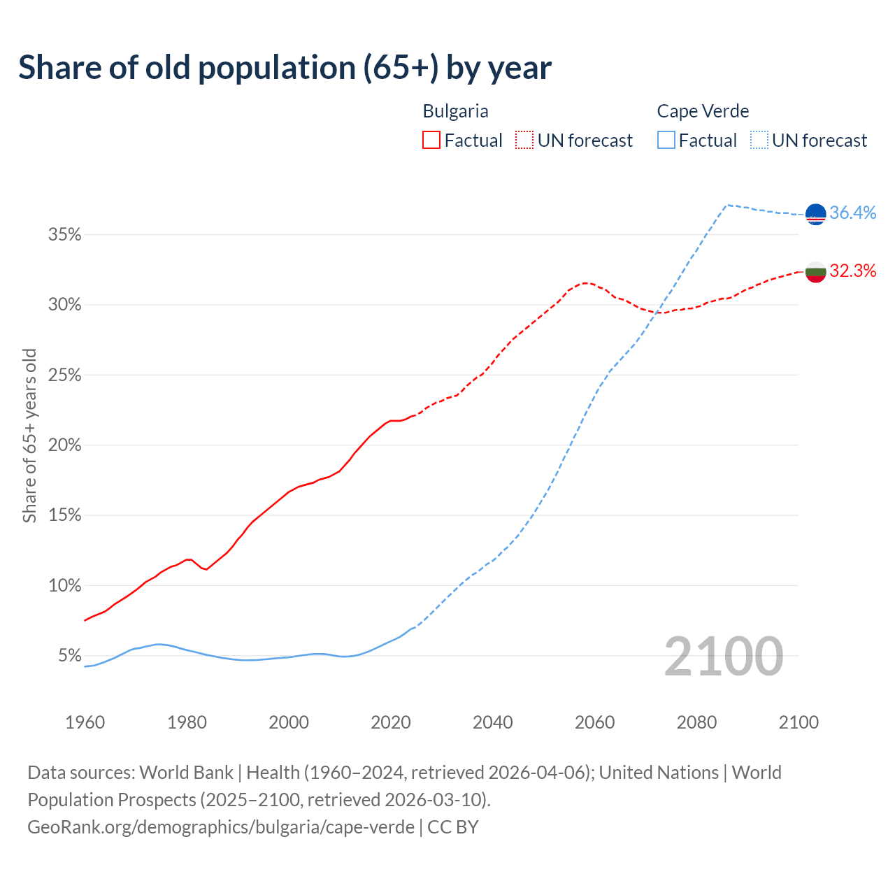 The share of older people aged 65 and over is 22% in Bulgaria and 6.86% in Cape Verde. Life expectancy in Bulgaria compared to Cape Verde .