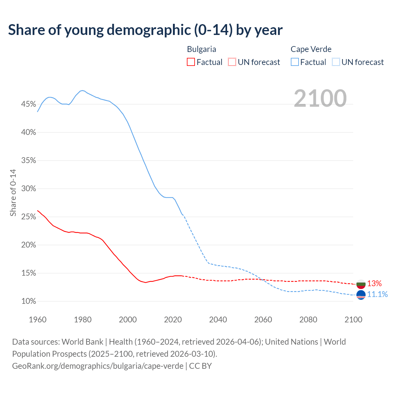- The share of young demographic (0-15 years old) in Bulgaria is 14.5% vs 25.5% in Cape Verde.