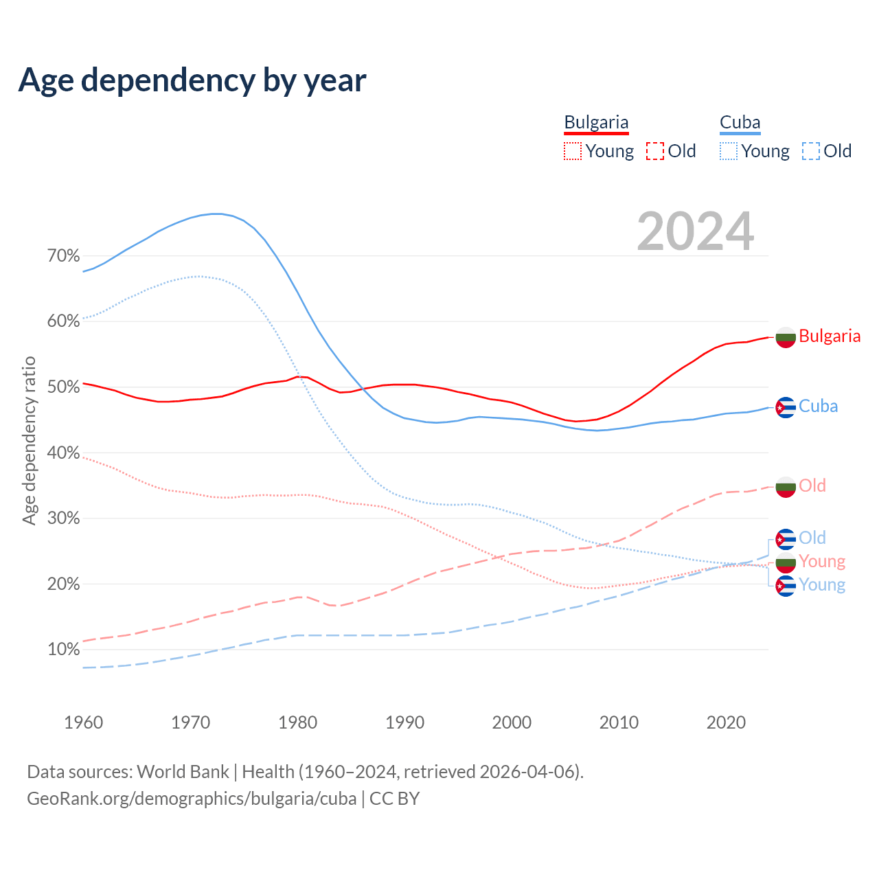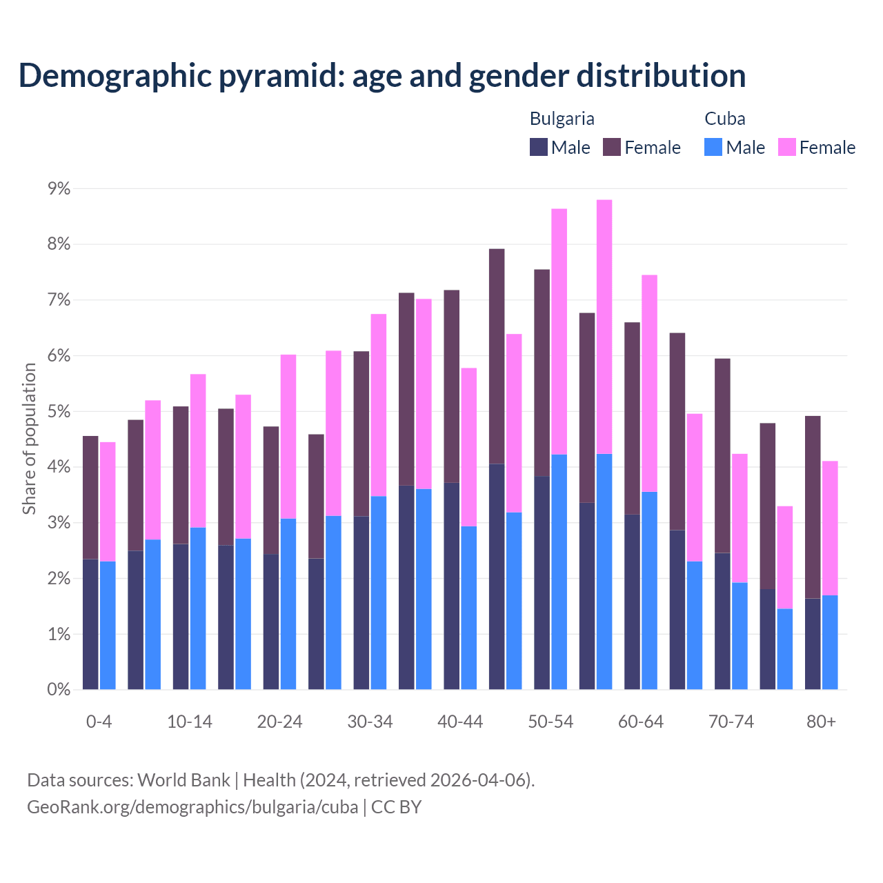 - Bulgaria is ranked 12/196 by median age (oldest to youngest) vs 27/196 for Cuba.